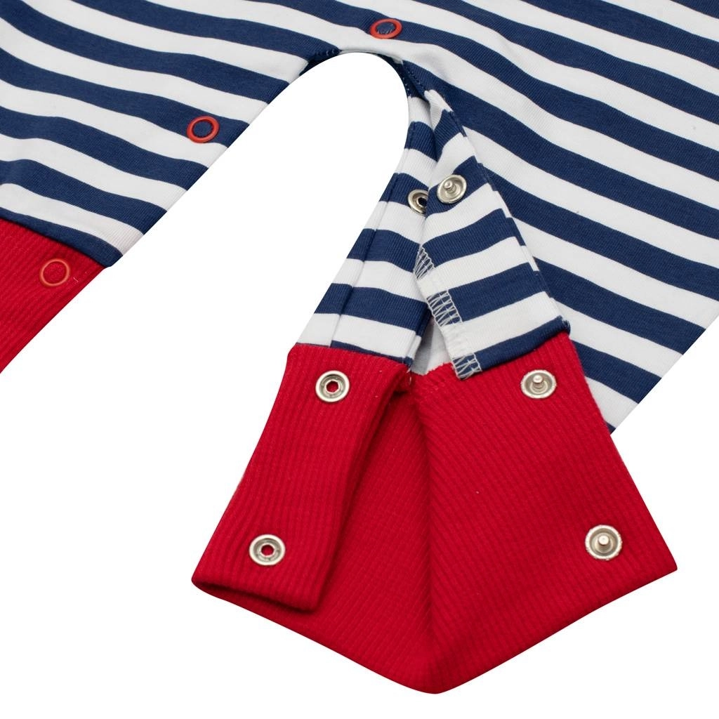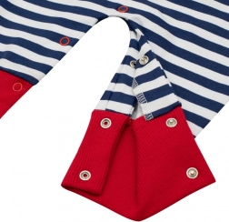 Elegante tutina estiva per neonati con righe stile marinaio e applicazione di barchetta. Realizzata in 100% cotone morbido, con comoda chiusura sulla spalla e tra le gambine per un facile vestirsi e cambiare il pannolino, e grazie al taglio mantiene sempre la schiena del bimbo coperta.