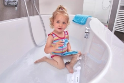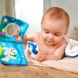 È incluso un divertente ciondolo con fischietto che invoglia a schiacciare, rafforza la motricità fine e porta gioia nella scoperta dei suoni. Il libretto galleggia in superficie e i bambini possono sfogliarlo direttamente durante il bagnetto.
