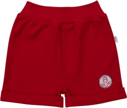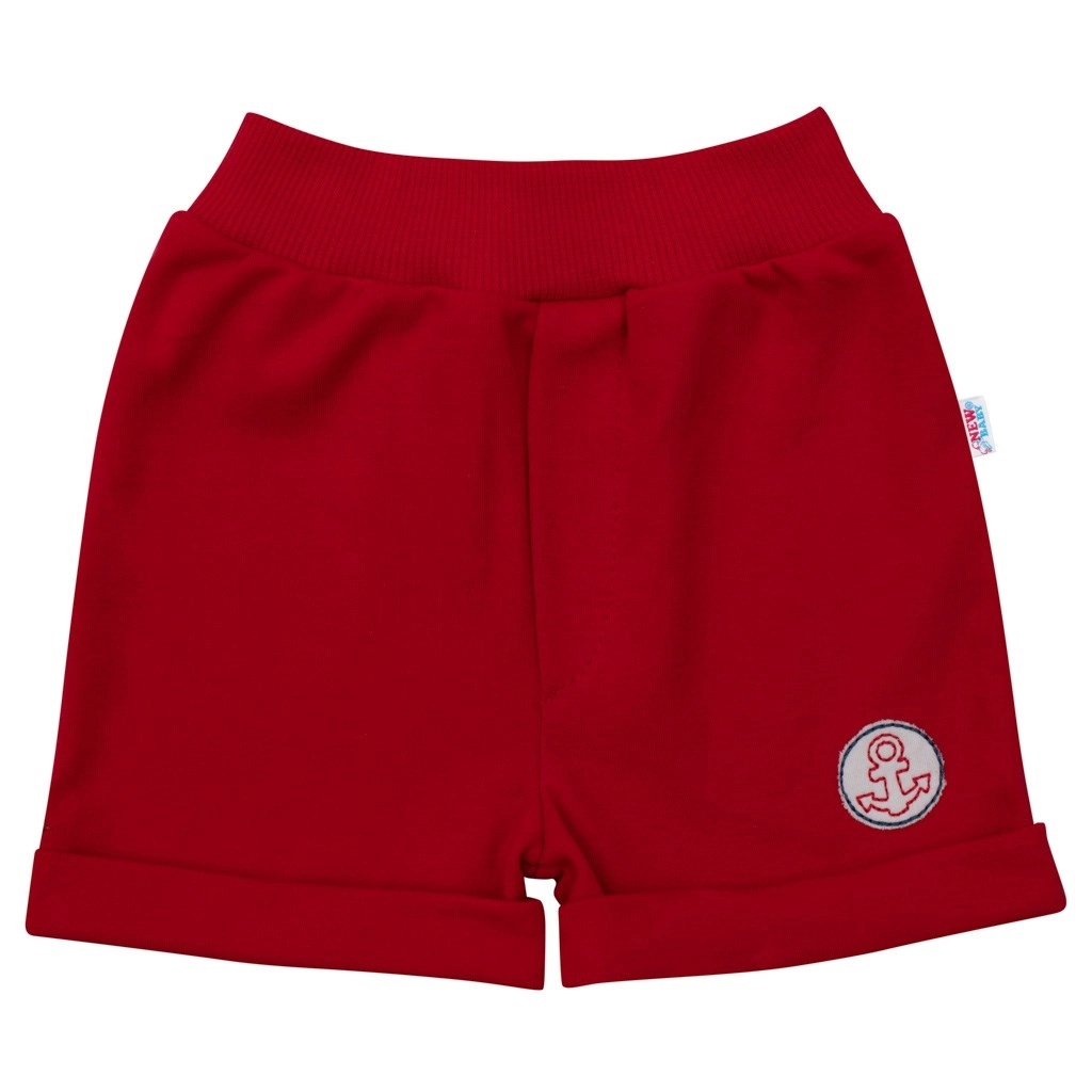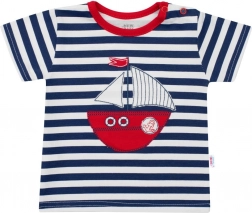 La maglietta a righe con applicazione di barchetta e i pantaloncini rossi creano un set alla moda per piccoli marinai.