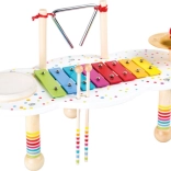 Il tavolino include quattro elementi sonori molto amati: xilofono con lamelle colorate, tamburino, triangolo e piatto. Il gioco sostiene la coordinazione occhio–mano, la concentrazione e la percezione uditiva. È un’introduzione giocosa al mondo della musica che stimola la fantasia e il gioco autonomo.