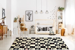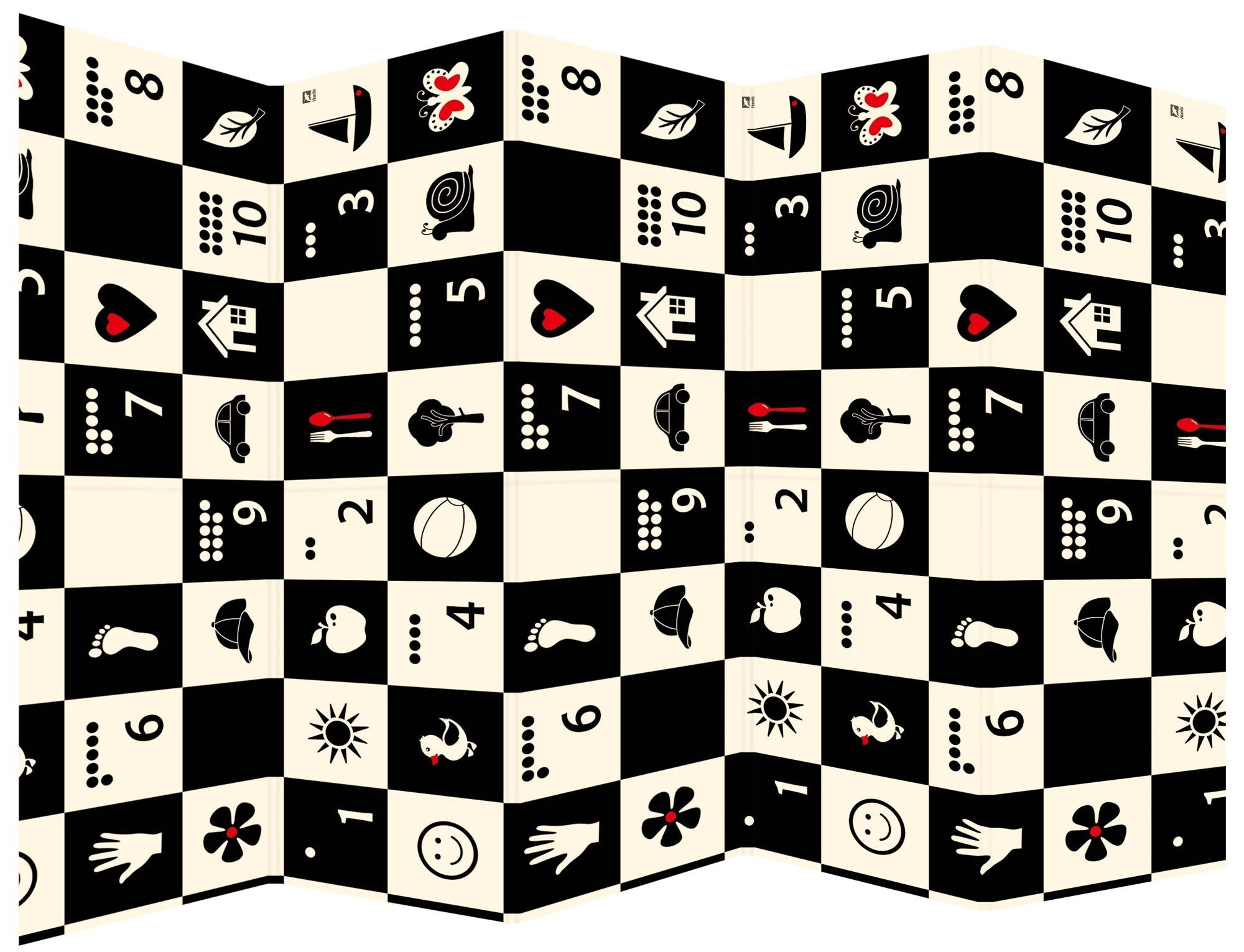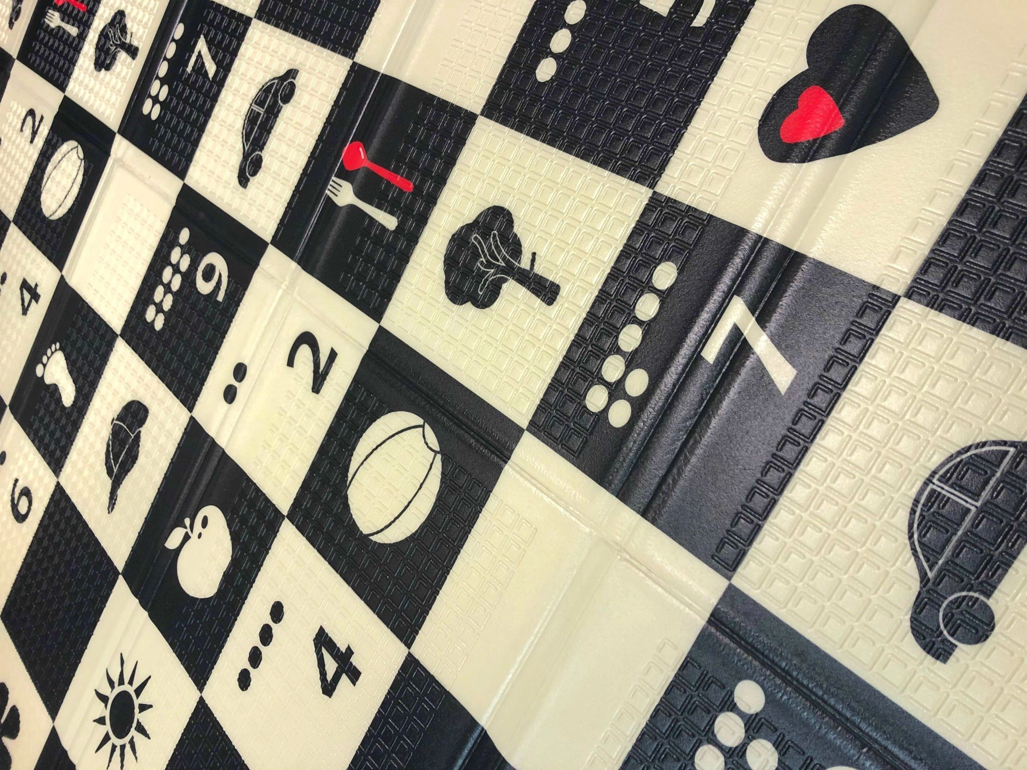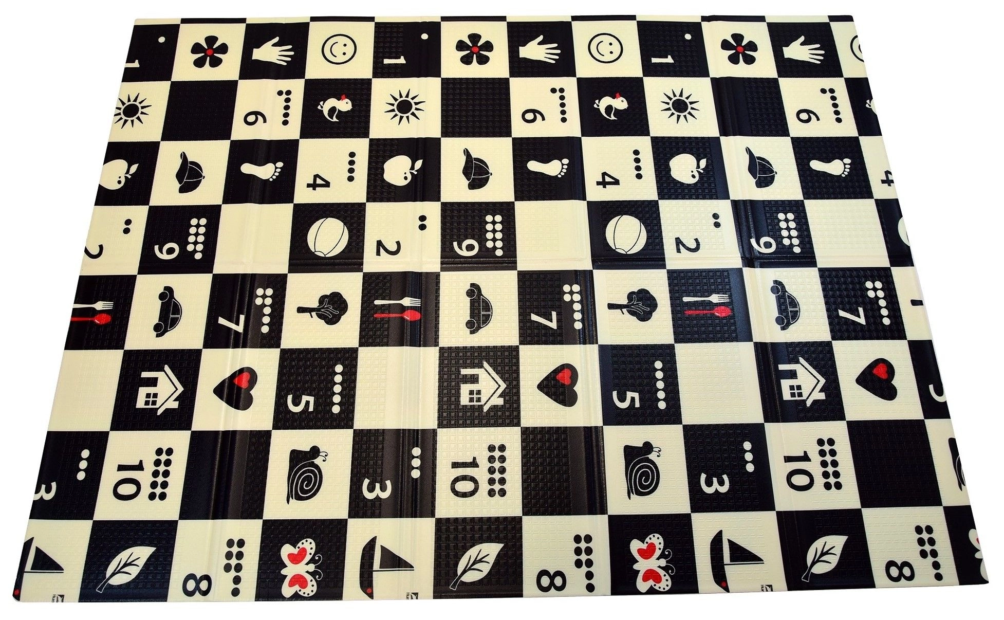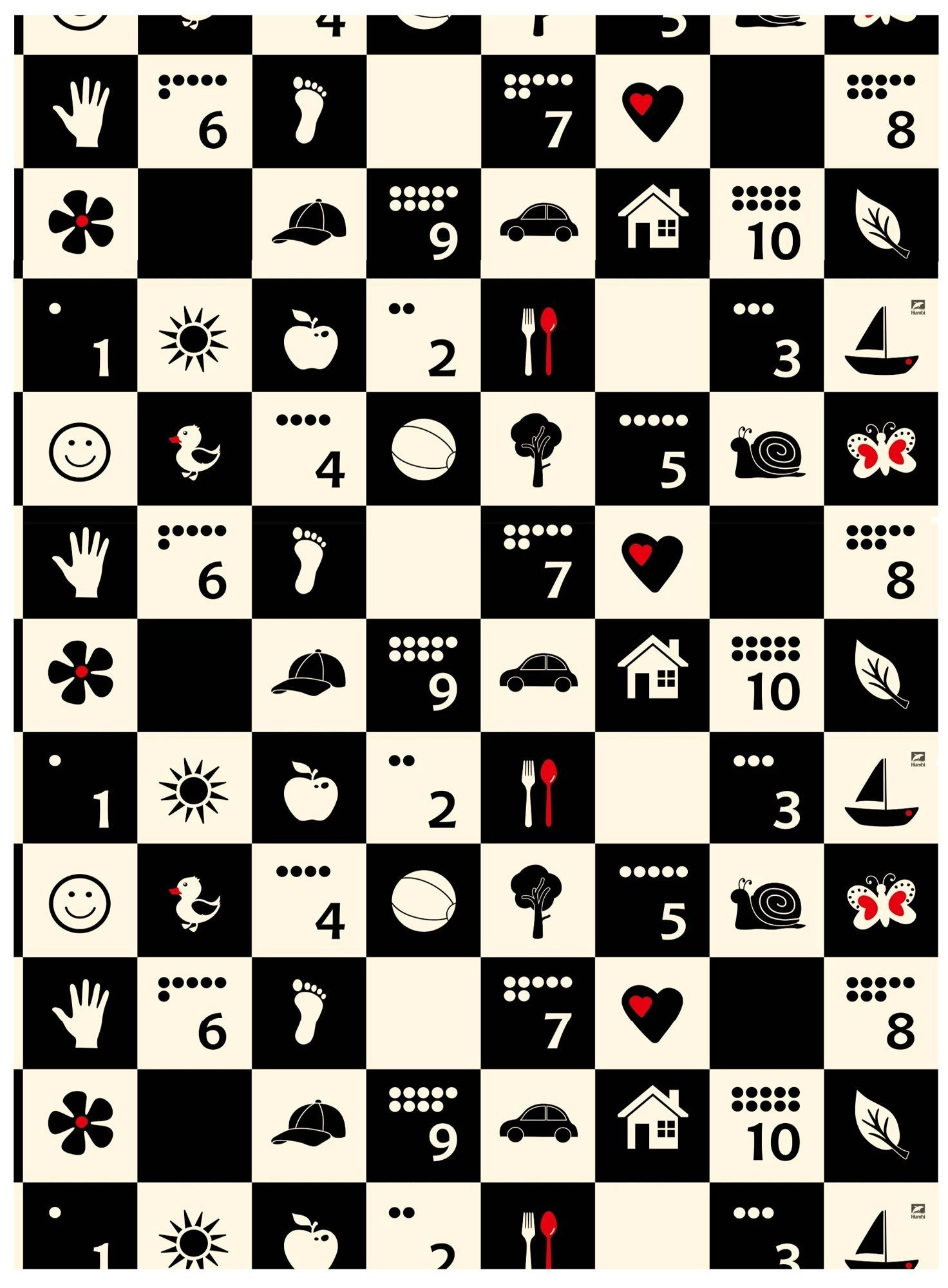 La scacchiera in bianco e nero con icone semplici stimola la vista, favorisce l’intelligenza visuo-spaziale e attira l’attenzione dei più piccoli.
