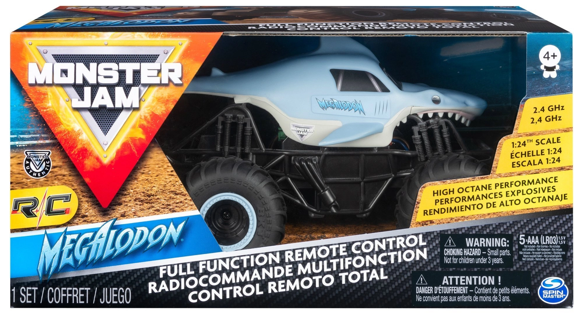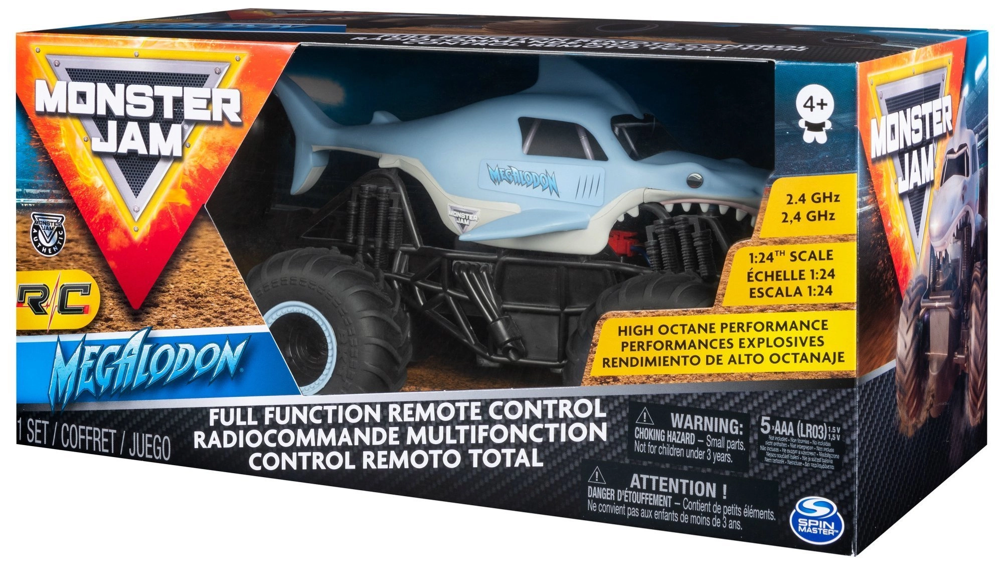 L’auto RC con licenza MONSTER JAM Megalodon offre l’aspetto autentico dell’iconico monster truck con carrozzeria blu in stile squalo, pinne e denti. La scala 1:24 è ideale per gare in casa e per le prime esperienze con i radiocomandi.