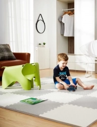 Il tappetino in schiuma HUMBI crea uno spazio sicuro e confortevole per neonati e bambini più grandi. Grazie allo spessore di 1 cm isola efficacemente dal pavimento freddo e ammortizza le cadute. Il colore grigio neutro si adatta a qualsiasi interno e i bordi puzzle modulari permettono di adeguare la forma allo spazio.