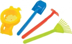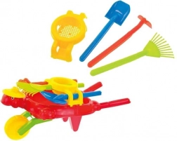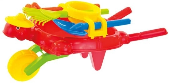 La grande ruota mobile garantisce una marcia fluida e stabile su diverse superfici, mentre i doppi supporti consentono di appoggiare la carriola in modo sicuro. Le impugnature ergonomiche sono adattate ai palmi dei bambini e favoriscono una presa salda. Nella confezione non mancano utili accessori: rastrello, paletta, zappetta e setaccio – ideali per trasportare terra, raccogliere foglie o setacciare la sabbia.