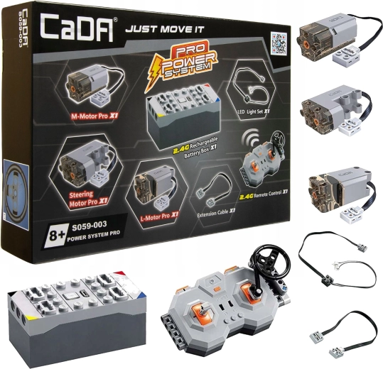 Il Pro Power System dona ai tuoi set CaDA vera trazione e maneggevolezza. Grazie alla combinazione di motori, servo sterzo, batteria e radiocomando a 2,4 GHz puoi muoverti avanti e indietro, sterzare, accendere/spegnere le luci LED e, su alcuni modelli, anche aprire o chiudere le porte. Ideale per i costruttori che desiderano trasformare modelli statici in veicoli RC pienamente funzionali.