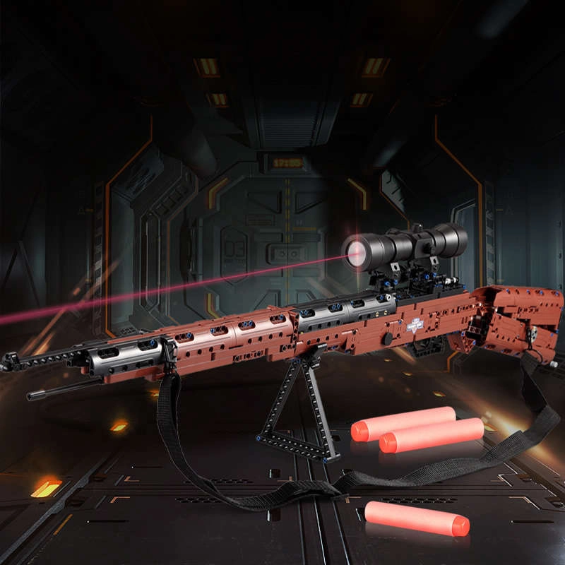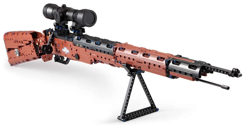Canna lunga, ottica, pannelli e connettori technic creano una replica fedele che spicca su qualsiasi mensola.
