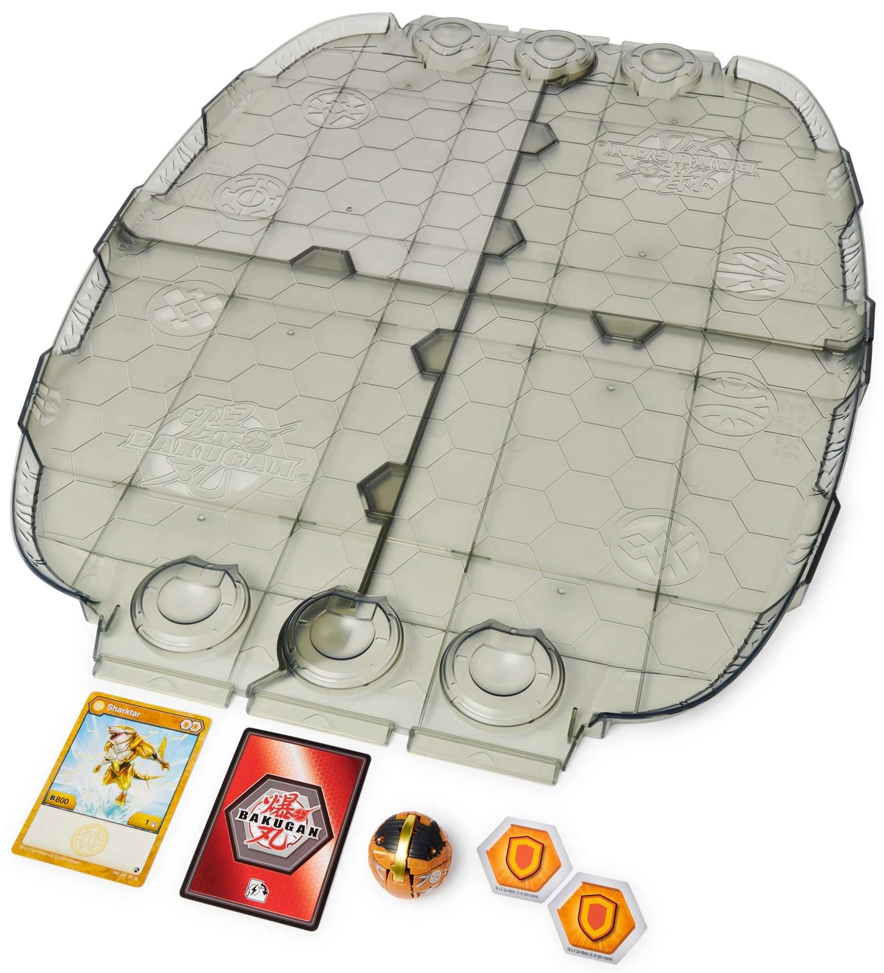 Nella confezione sono inclusi l'esclusivo Bakugan Sharktar, una carta personaggio e una carta abilità, che ampliano le possibilità tattiche e la collezione. Il set è ideale come prima arena o come ottima espansione per tutti i fan della serie BAKUGAN GEOGAN RISING.