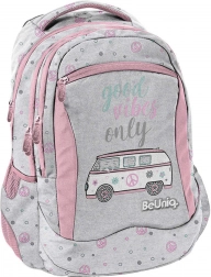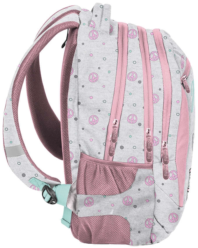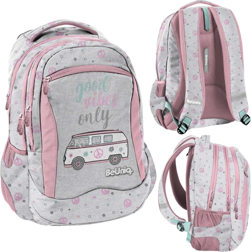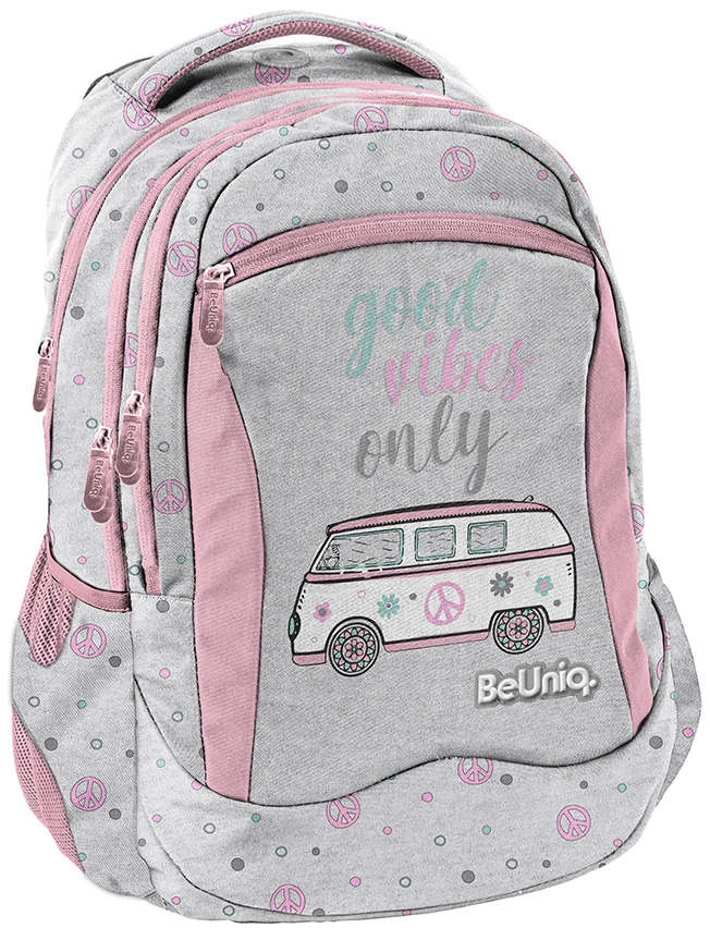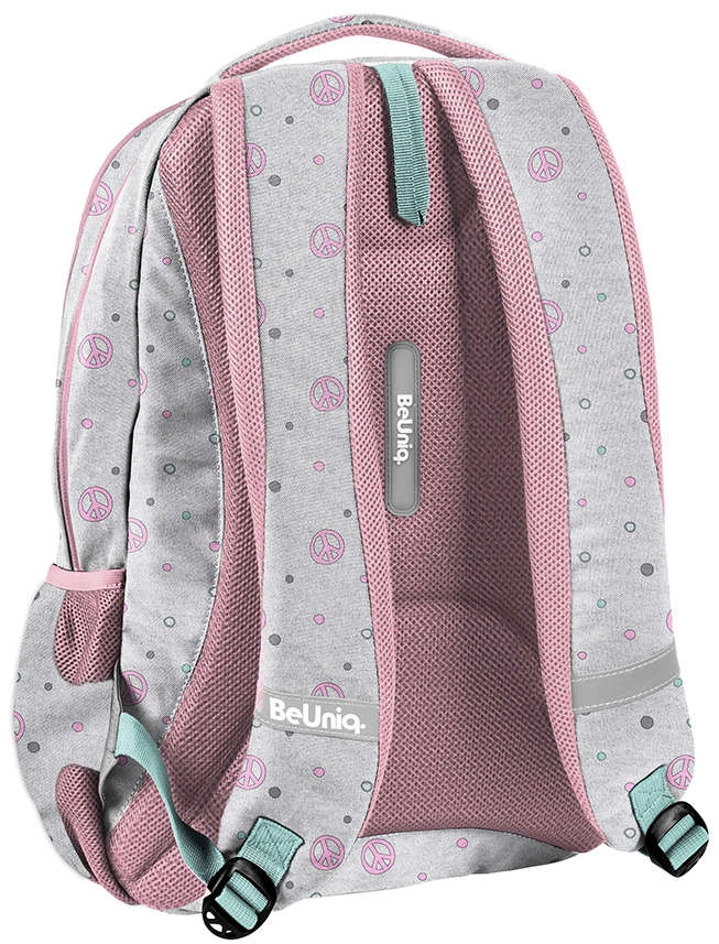 Lo zaino scolastico BeUniq Good Vibes Only del marchio Paso, in elegante combinazione grigio‑rosa, offre 3 scomparti spaziosi, tasca frontale con zip e reti laterali per la borraccia. Dispone di schienale ergonomico imbottito, spallacci comodi e regolabili, pannello posteriore traspirante e elementi riflettenti per la sicurezza. Il materiale resistente e le cerniere di qualità garantiscono lunga durata e comfort quotidiano.