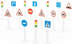 Nella confezione trovi 16 segnali alti circa 9,5 cm e adesivi per la loro etichettatura. Grazie alla struttura in plastica leggera, i bambini li maneggiano con facilità e possono allenare l'orientamento nel traffico: dal passaggio pedonale al divieto di accesso fino al limite di velocità.
