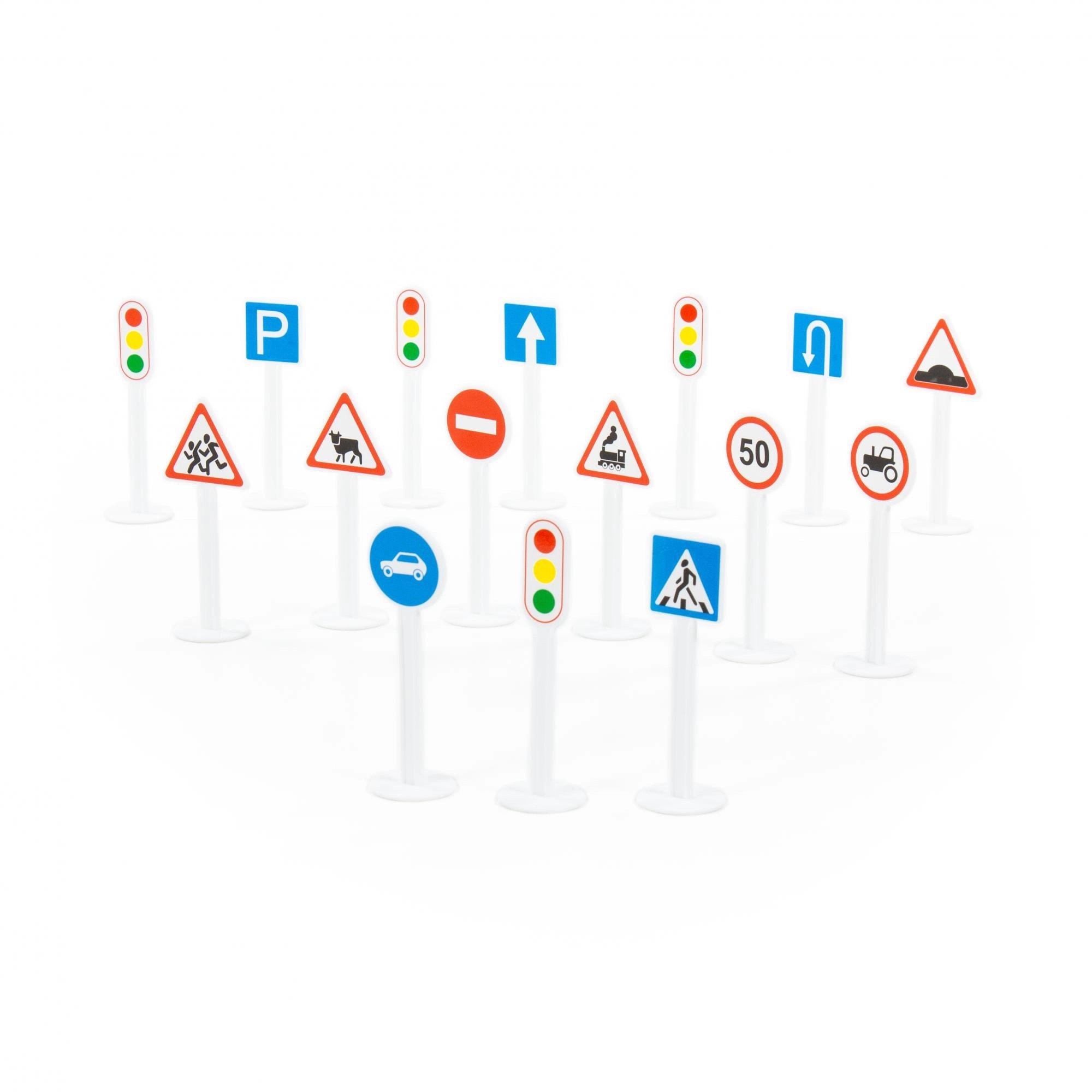 Questo set educativo di segnali stradali offre ai bambini un modo ludico per familiarizzare con le regole del traffico. Ogni segnale ha un pittogramma chiaro ed è montato su una base stabile, perfetto per giocare con le macchinine, attività didattiche e scenari modellati in classe.