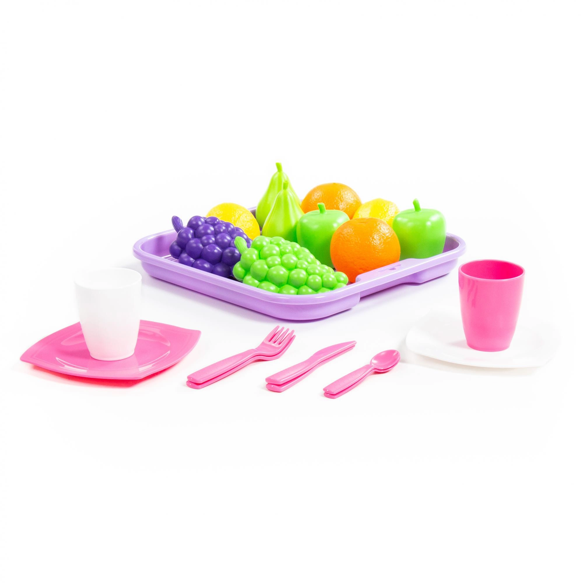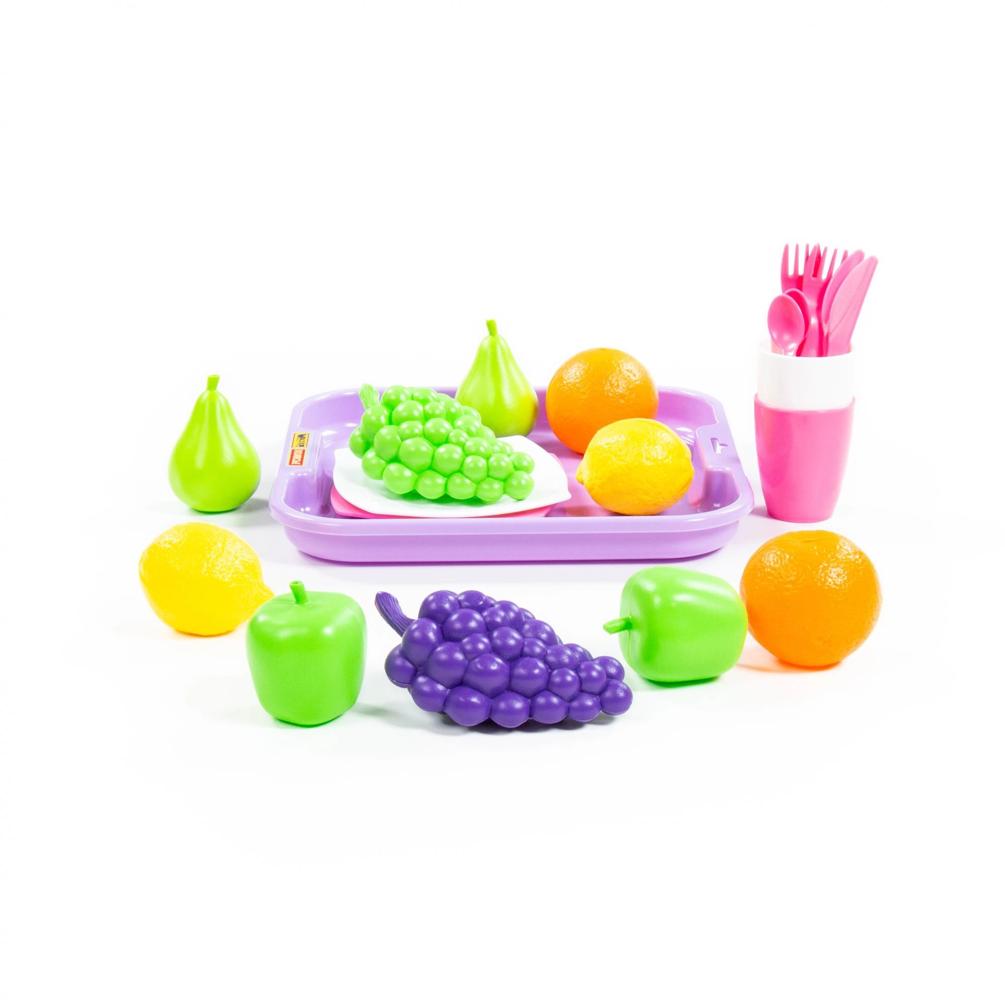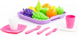 - Frutta in plastica, piattini, bicchieri, posate, vassoio
