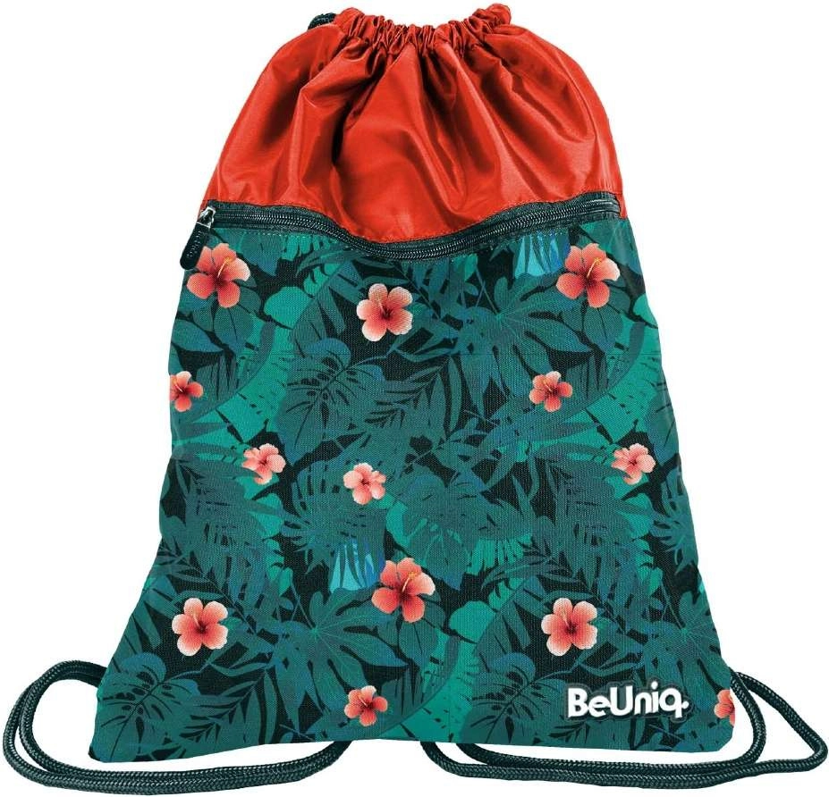 Sacca sportiva PASO elegante e pratica in colore verde scuro con elementi rossi e motivo floreale, realizzata in poliestere di alta qualità e idrorepellente. È leggera, dispone di ampio scomparto principale con chiusura a cordino, tasca con zip e schienale imbottito con inserti in rete per un comfort superiore.