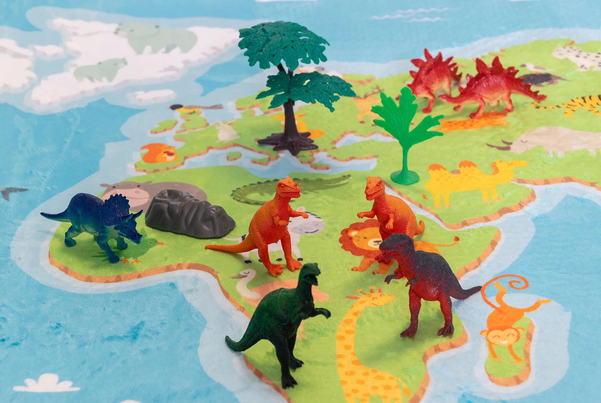 La varietà di dinosauri, alberi e rocce permette ai bambini di creare scenari preistorici personalizzati e di sviluppare fantasia e concentrazione nel gioco.