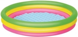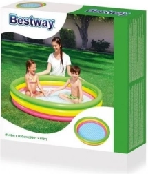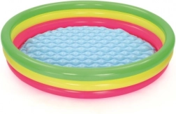 La piscina circolare arcobaleno in vinile resistente offre comfort e sicurezza durante i giochi d'acqua dei bambini. Il fondo morbido, gonfiabile e testurizzato attenua i passi e isola dal freddo del terreno, risultando perfetta sia sul prato sia sul terrazzo. I tre anelli gonfiabili indipendenti mantengono la forma e aumentano la stabilità della struttura.