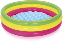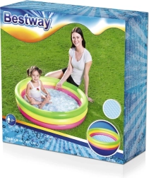 La piscina leggera e compatta con diametro di 102 cm e altezza di 25 cm è un'ottima scelta per bambini dai 2 anni. I tre anelli colorati con valvole separate assicurano stabilità e sicurezza durante il gioco, mentre il fondo gonfiabile offre comfort extra anche su superfici più dure. La capacità di 62 litri è perfetta per un piacevole rinfresco e per i primi giochi d'acqua.