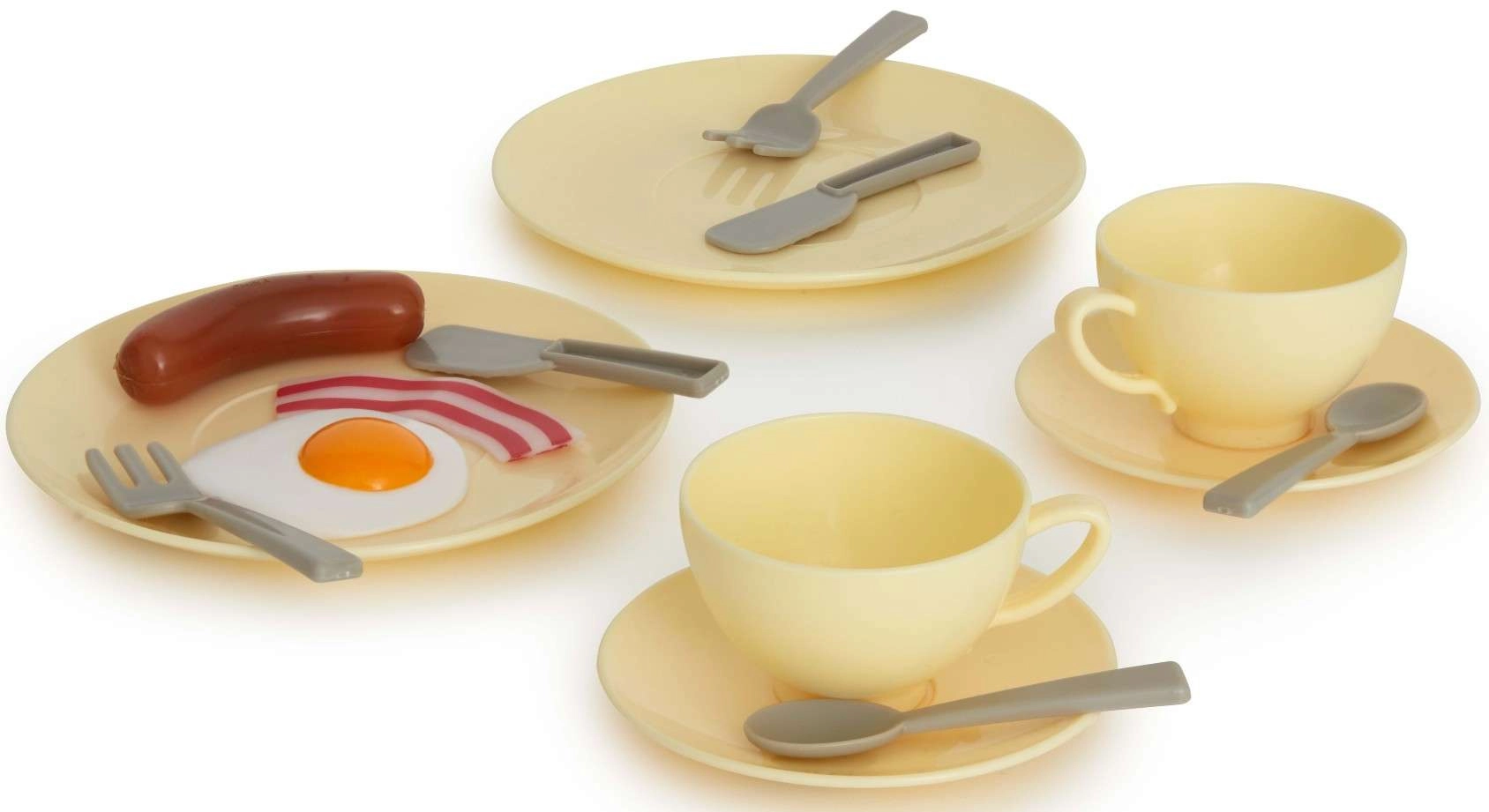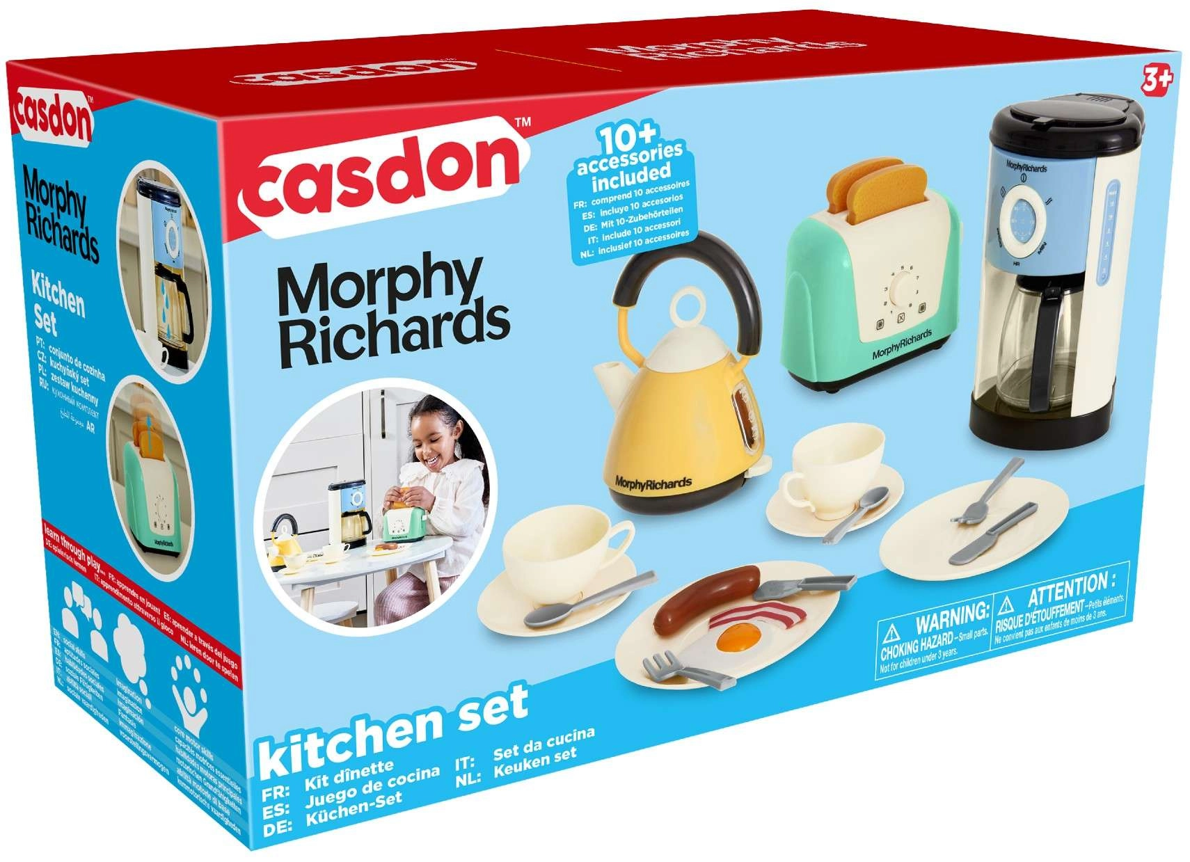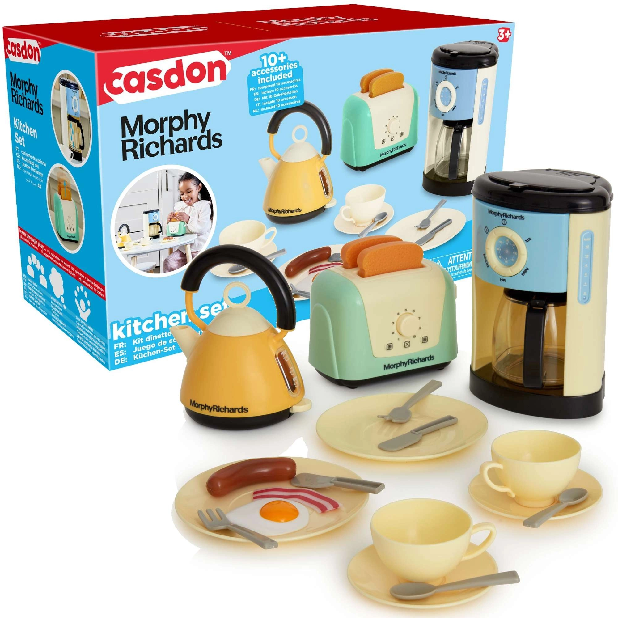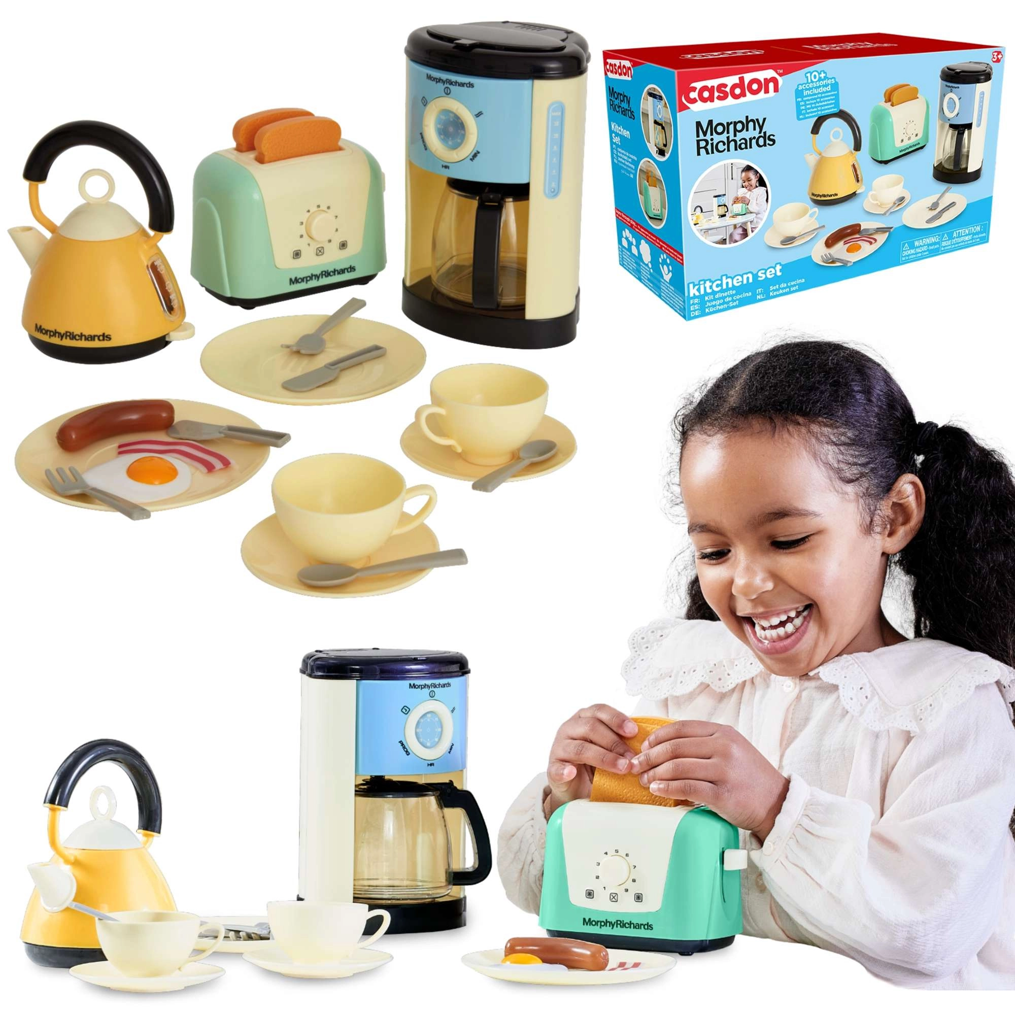 Questo set cucina per bambini dal design moderno offre tutto ciò di cui i piccoli chef hanno bisogno per preparare la “colazione perfetta”. Include una macchina del caffè con flusso d’acqua e caraffa, un bollitore elettrico con impugnatura comoda e indicatore del livello, un tostapane con funzione di espulsione dei toast, piattini, posate, tazze con piattini e un set di “alimenti” (toast, wurstel, una fetta di pancetta e un uovo all’occhio di bue).