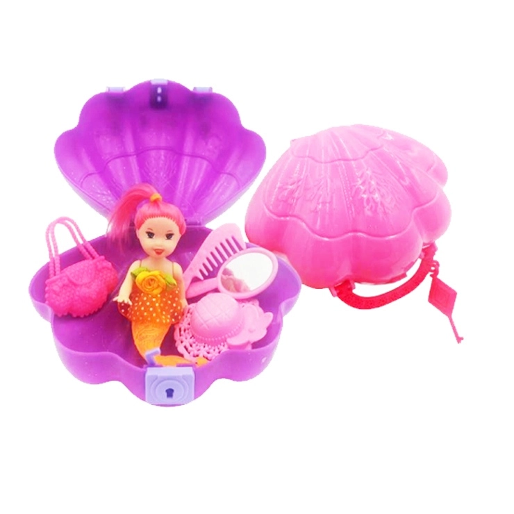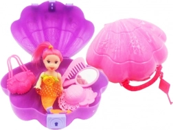 Delizioso set con bambola – una sirena in una valigetta di plastica a forma di conchiglia, ideale per i viaggi. Include tutto il necessario per un gioco creativo: sirena, cappellino, specchietto, pettinino, borsetta e chiavetta. Disponibile in tre colori – rosa, viola o blu. Non adatto a bambini sotto i 3 anni.