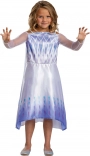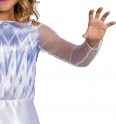 Abito in delicate tonalità di azzurro e viola con dettagli argentati e stampa sul corpetto e sull’orlo della gonna che riflette fedelmente lo stile di ELSA di FROZEN.