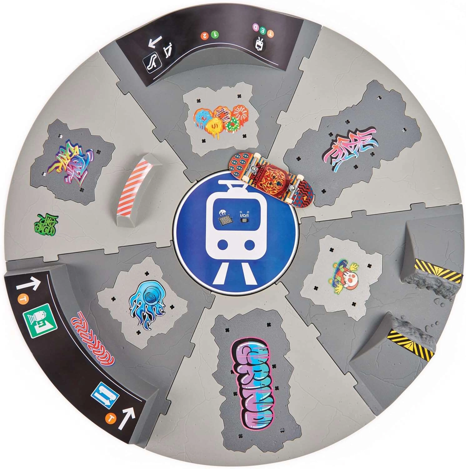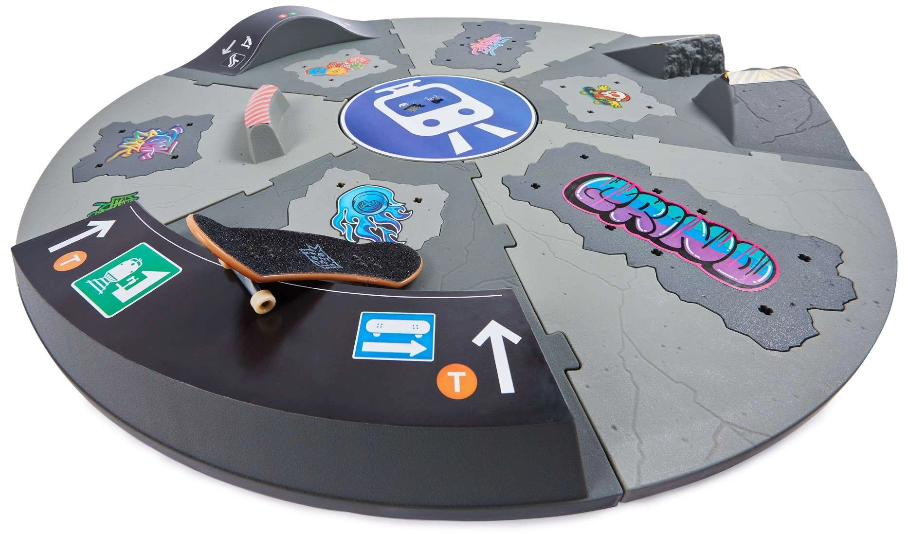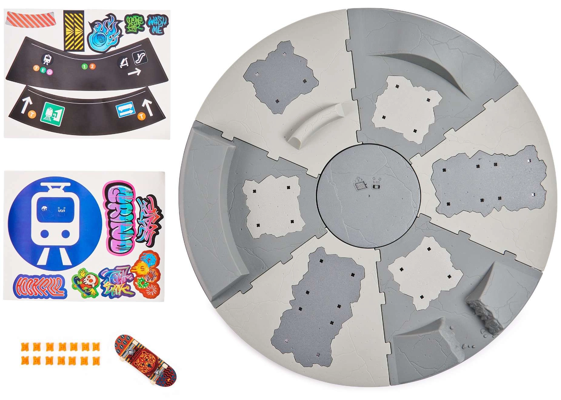 Crea uno skatepark compatto da tavolo e mostra il meglio del fingerboarding. La base rotante con segmenti, rampe e corrimano consente una rotazione fluida a 360°, così puoi cambiare direzione e difficoltà dei trick senza riconfigurare il park. Ideale per allenare ollie, grind e manual.