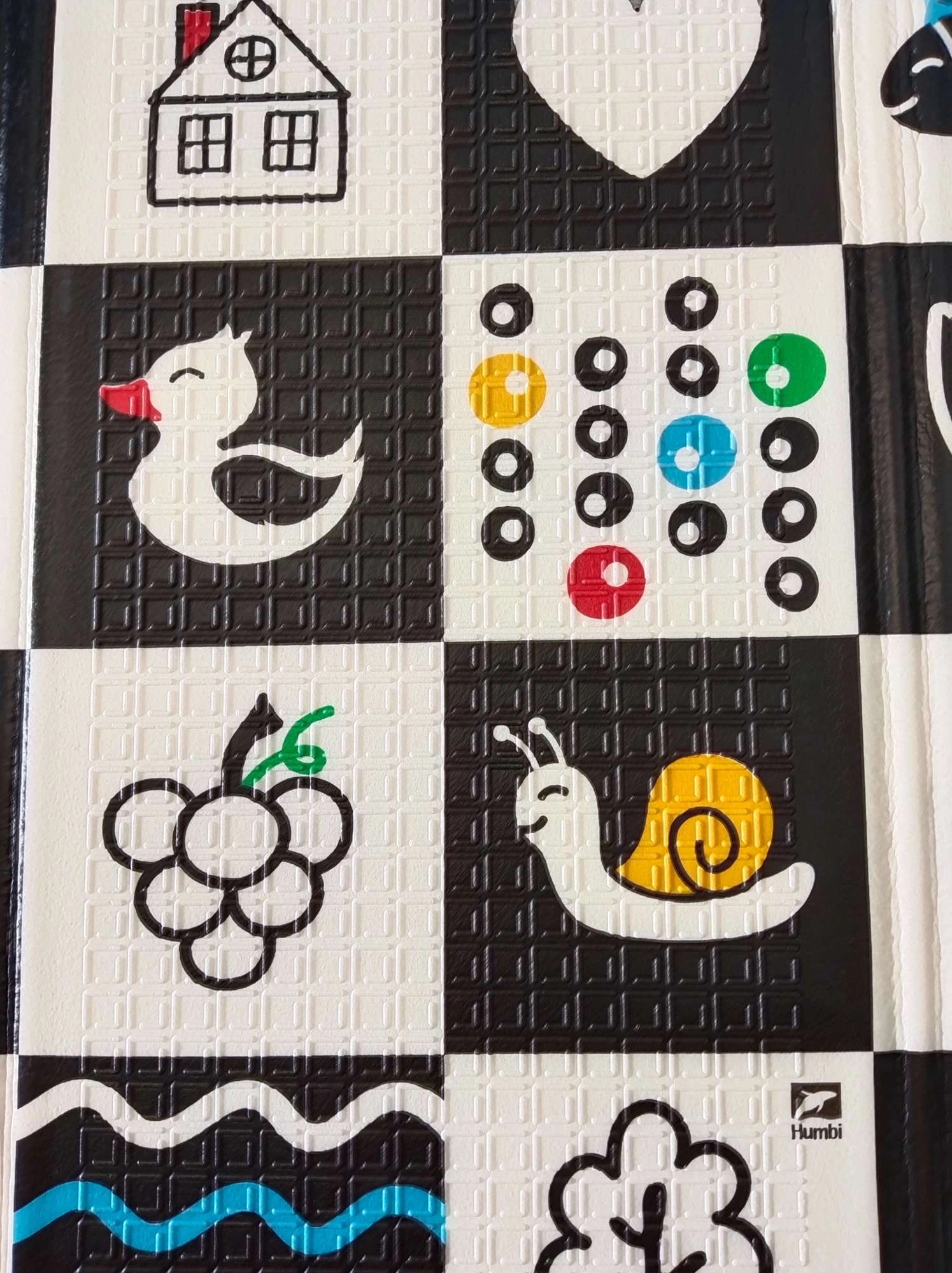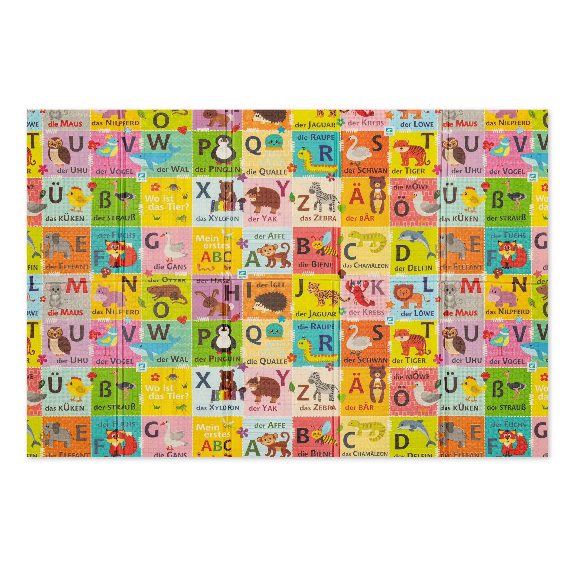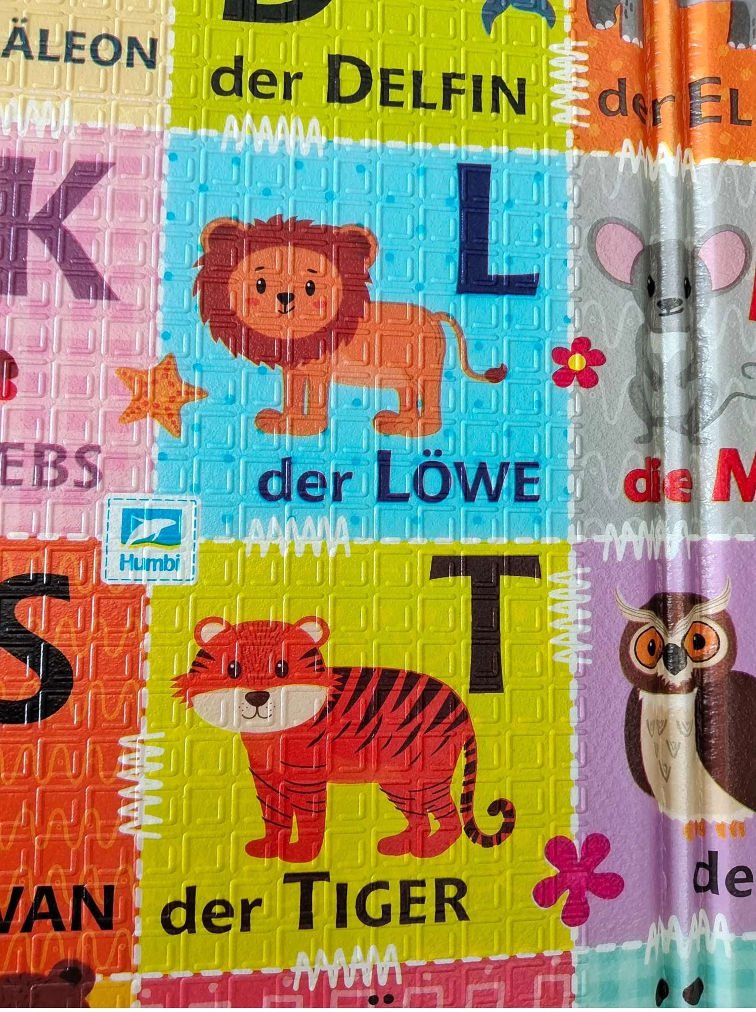 Il tappetino per bambini HUMBI, double-face e realizzato in resistente schiuma XPE, misura 120 × 180 cm e offre morbida ammortizzazione, superficie antiscivolo e facile pulizia. Un lato è colorato con alfabeto tedesco e animaletti, l’altro è in contrasto bianco e nero per la stimolazione visiva dei neonati. Isola perfettamente dal freddo, è impermeabile ed è ideale per gioco, esercizi e primi passi.