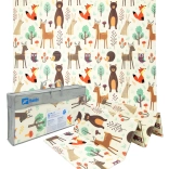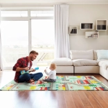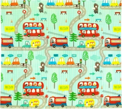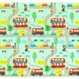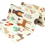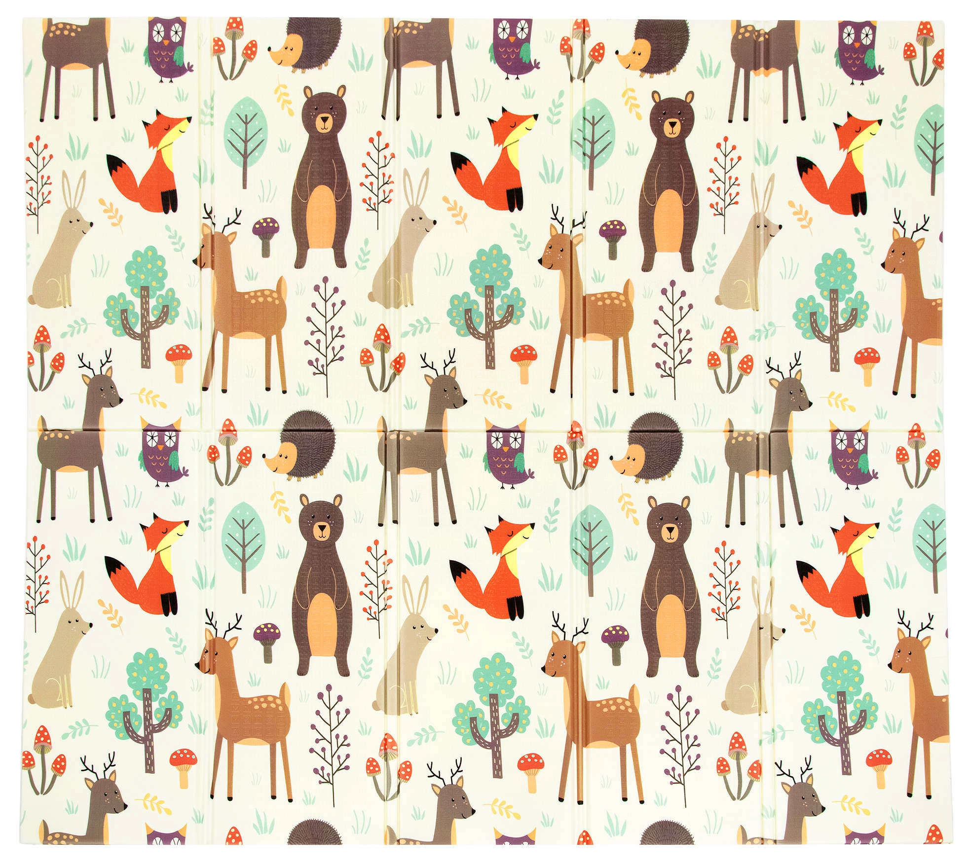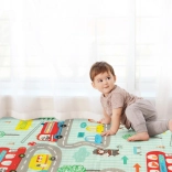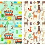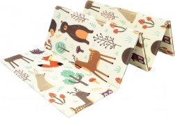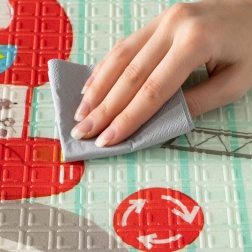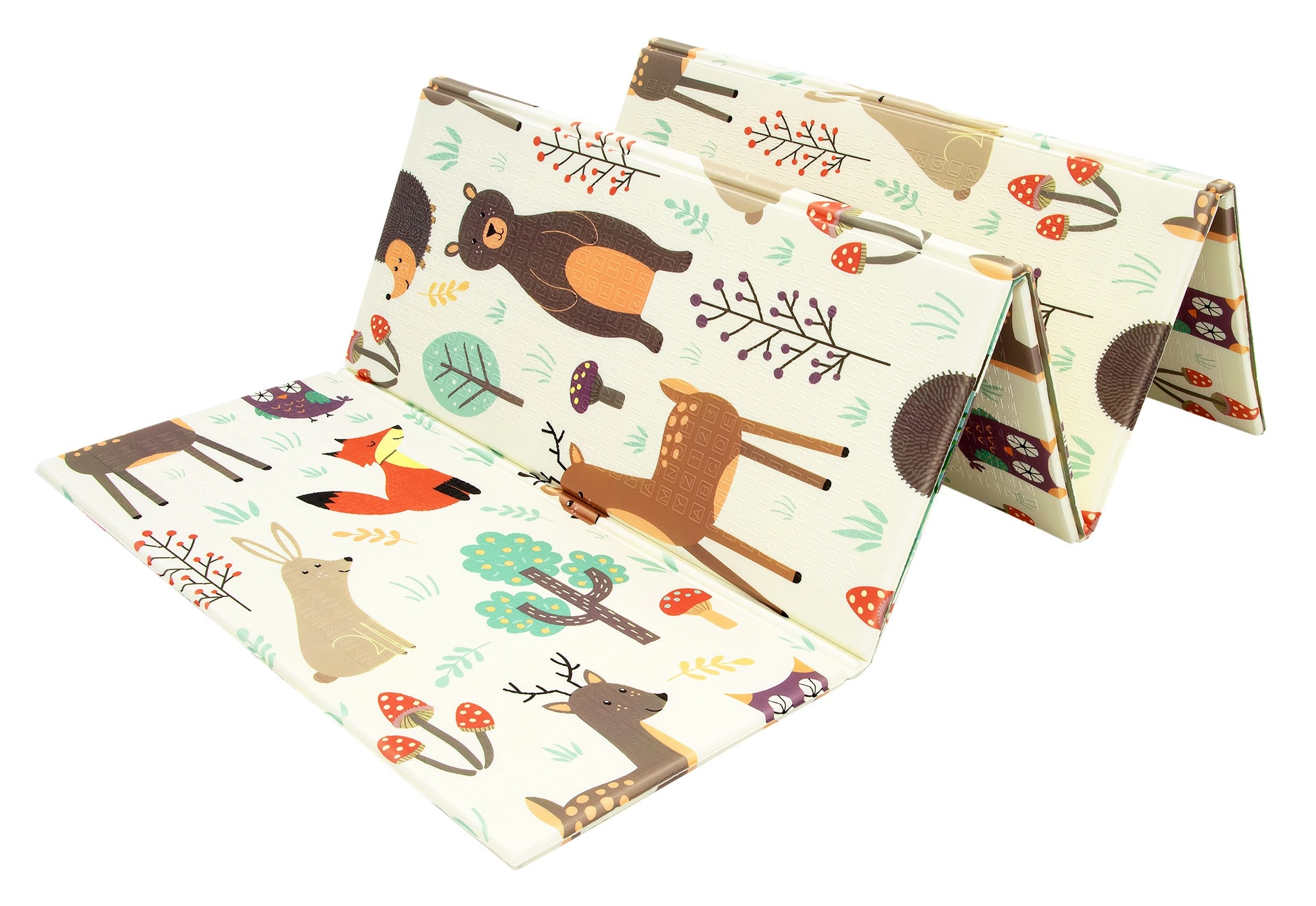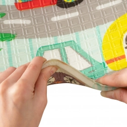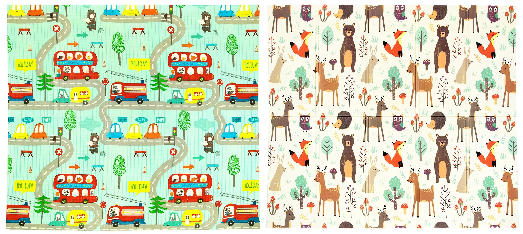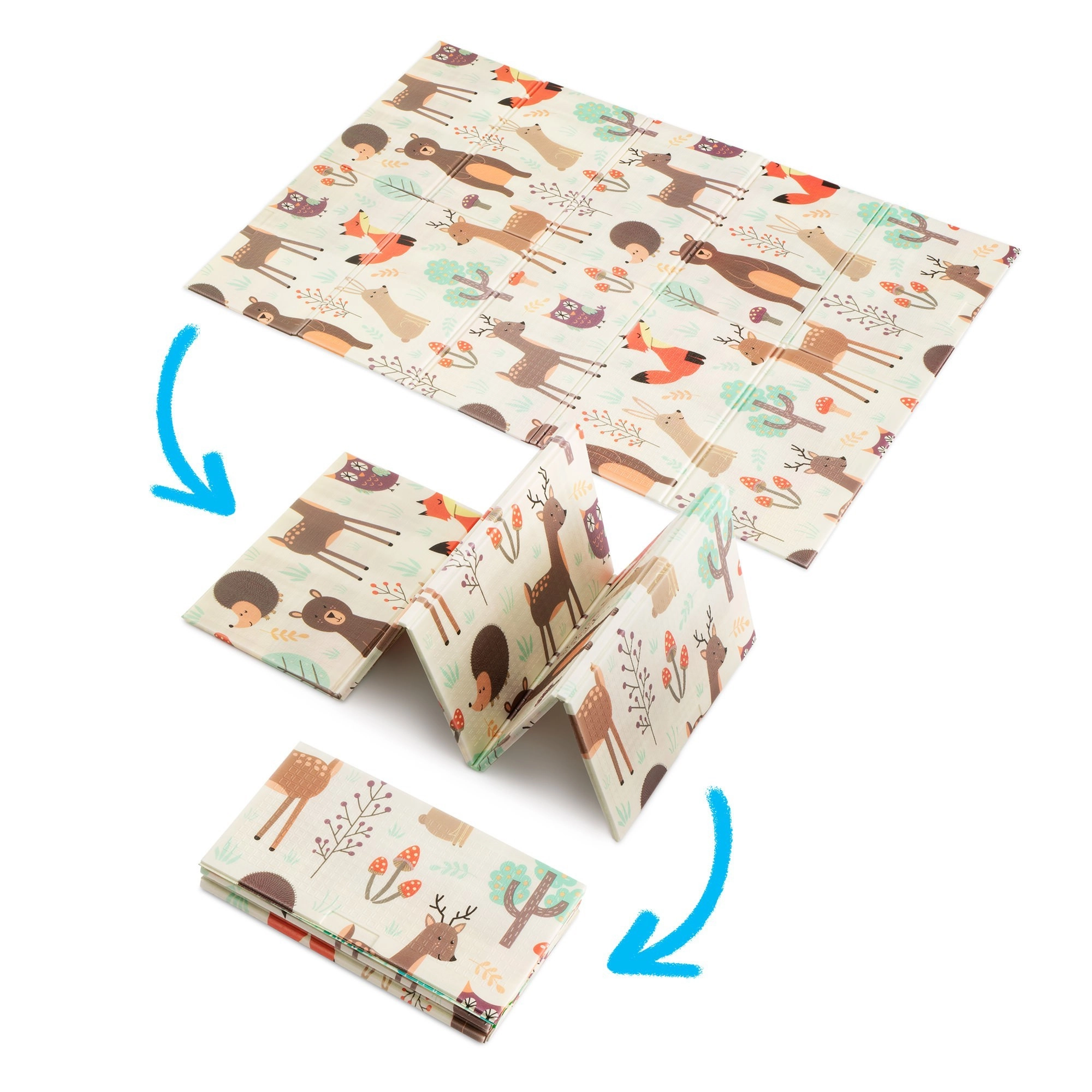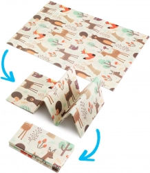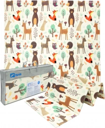 Il tappetino è double-face: un lato con delicati motivi di animaletti del bosco, l’altro con divertenti stradine colorate. Si piega facilmente in un formato compatto, è leggero e grazie alla borsa con cerniera e manici lo porti in salotto, in cameretta, in giardino o al picnic. La superficie impermeabile si pulisce con un panno umido: una soluzione igienica adatta anche ad allergici.