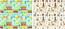 Due grafiche educative che stimolano fantasia e apprendimento: simpatici animaletti del bosco e colorate stradine su sfondo turchese.