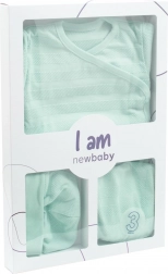 Adorabile set neonato 3 pezzi NEW BABY I AM in colore menta, ideale per la nascita e i primi mesi. Include body incrociato a manica lunga, pantaloni con piedini (polodupačky) e cappellino in morbido 100% cotone. La comoda chiusura laterale con bottoncini a pressione facilita la vestizione, l’elastico ampio e morbido in vita non comprime il pancino e il cappellino soffice resta ben fermo sulla testolina. Fornito in una scatola regalo eco.