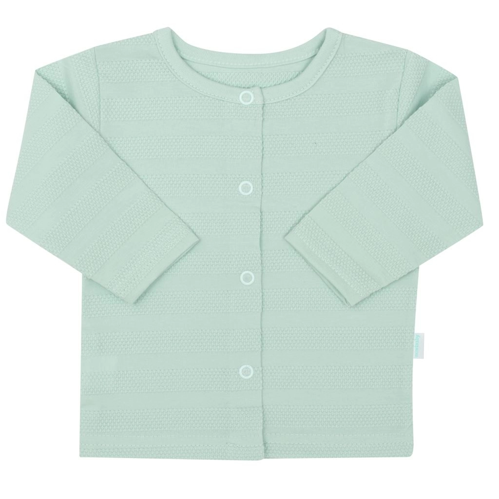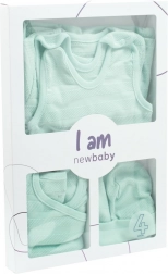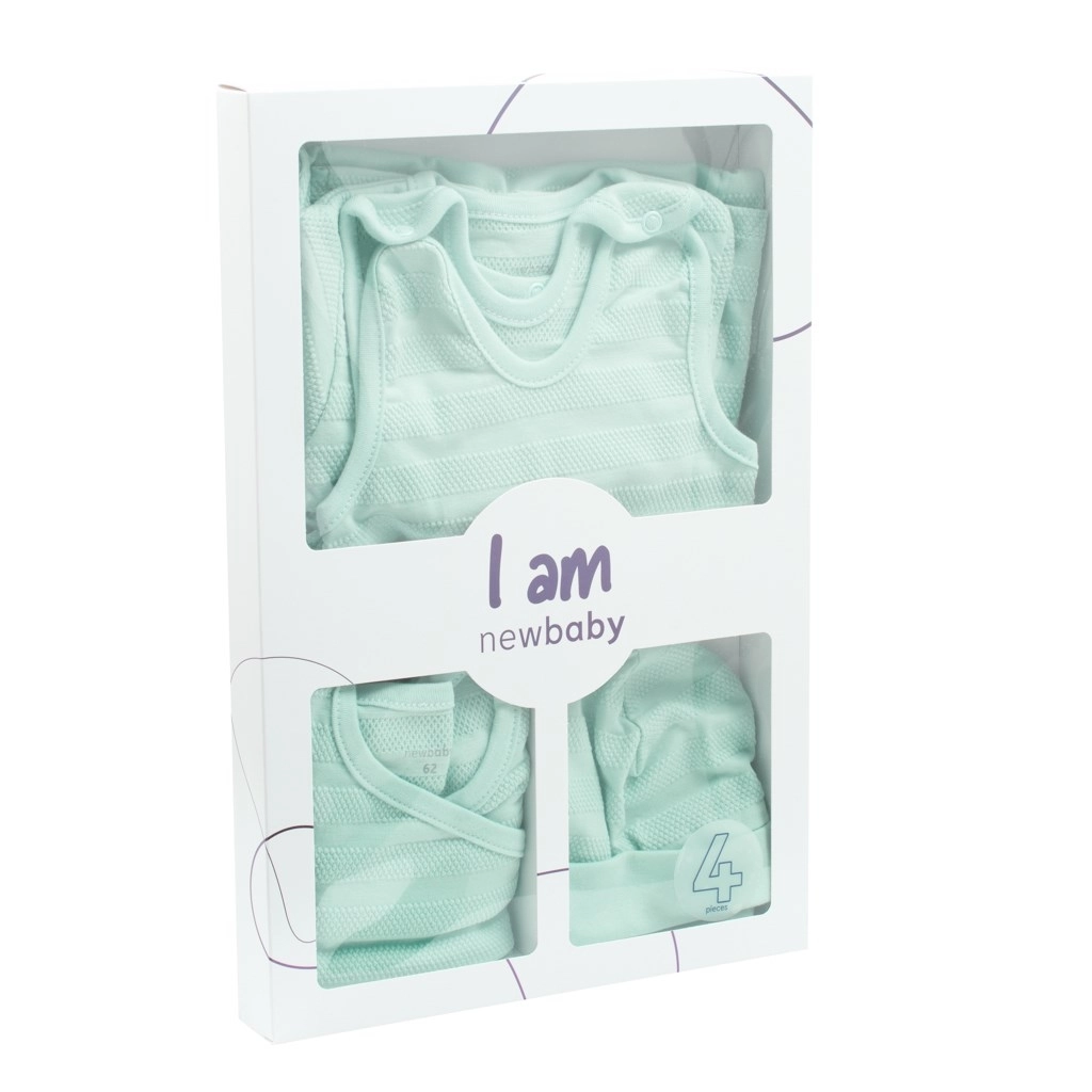 Delizioso set neonato 4 pezzi per la nascita NEW BABY I AM in colore menta, realizzato in 100% cotone morbido delicato sulla pelle sensibile del bebè. Il set comprende un body a maniche lunghe con bottoncini a pressione su tutta la lunghezza, salopette/pagliaccetto con chiusura sulle spalle e tra le gambine, giacchino con bottoncini a pressione e cappellino con bordo più ampio che resta ben fermo senza stringere.
