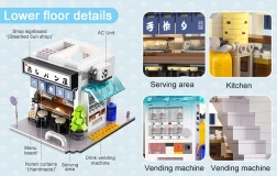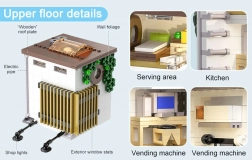 La parete laterale apribile svela ambienti dettagliati – dal bancone e distributore di bevande alla scala e alla accogliente camera da letto con computer, letto, armadio e climatizzatore. Dettagli esterni come palo elettrico, condotto di aerazione, finestre, grondaia, climatizzatore, insegna e menù sottolineano il carattere da collezione del modello.