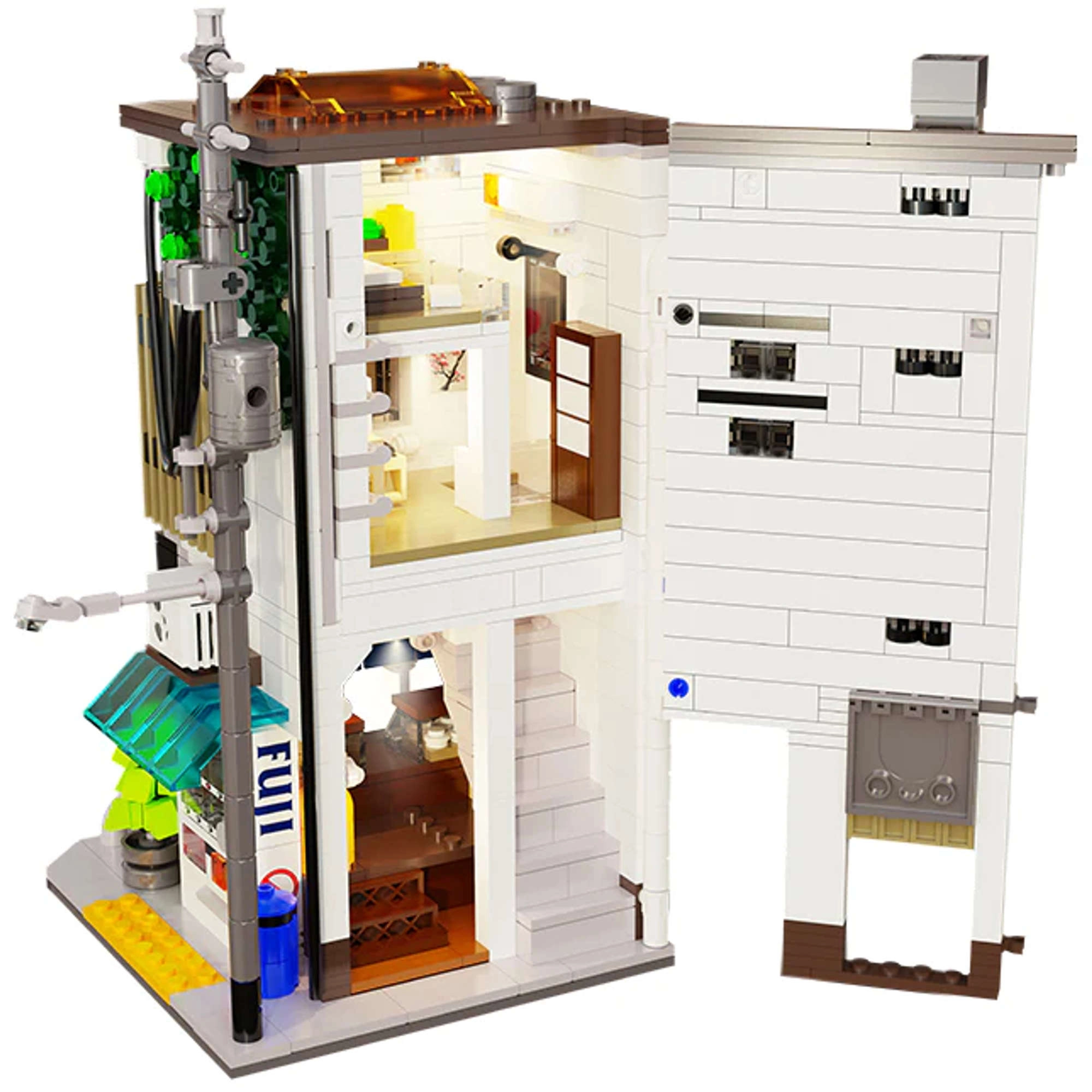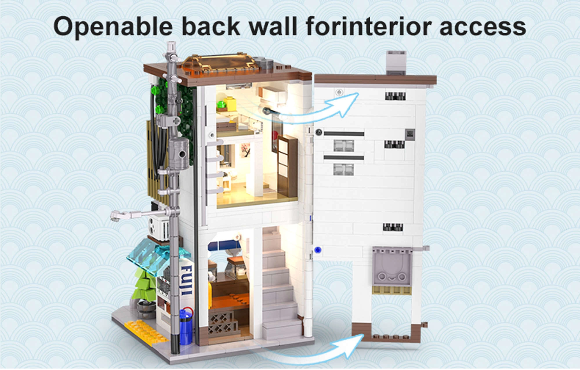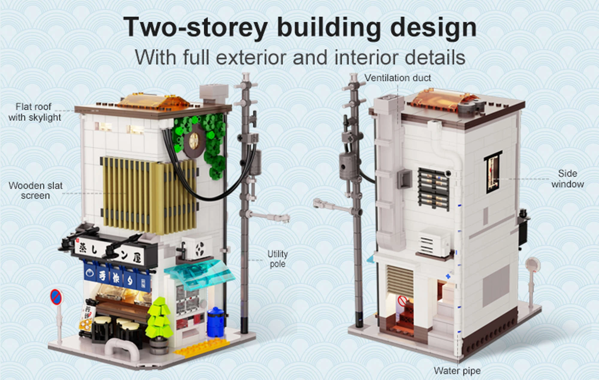 Questo elegante set CaDA porta l’autentica atmosfera dei vicoli giapponesi. Il negozio a due piani di panini al vapore colpisce per la facciata realistica, le funzioni per un facile accesso agli interni e il modulo LED che dona al modello un unico fascino serale.