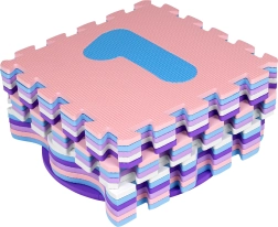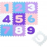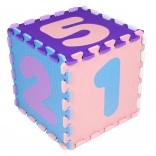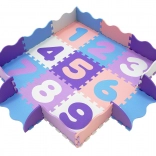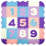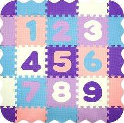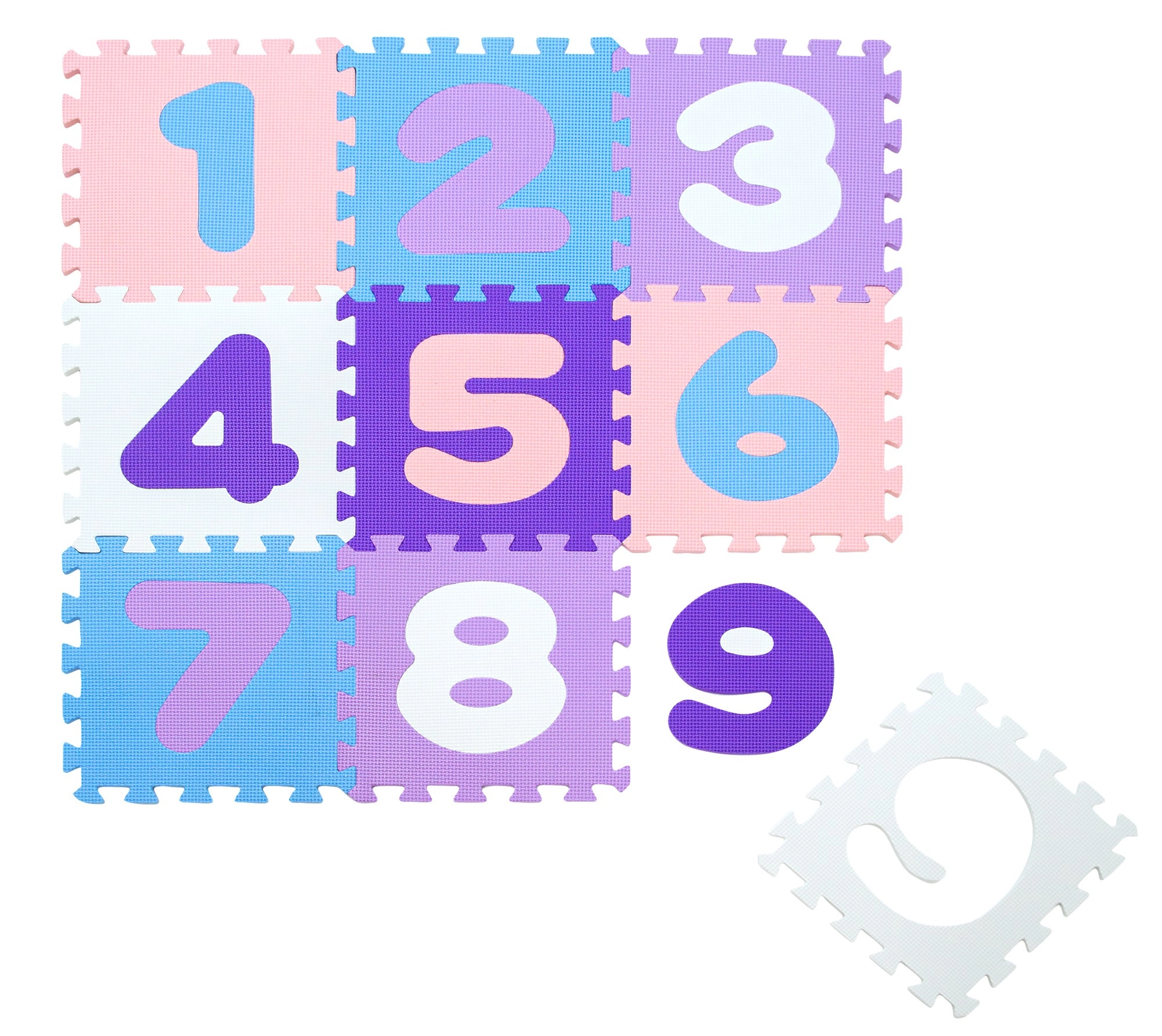 Ogni pezzo ha un elemento estraibile – una cifra da 1 a 9. I bambini allenano così riconoscimento dei numeri, coordinazione e pensiero spaziale. I pezzi possono essere collegati in piano o in forme 3D (ad es. cubo). Il materiale EVA è privo di ftalati, formammide, BPA e PVC, isola ottimamente dal freddo del pavimento e assorbe gli urti.