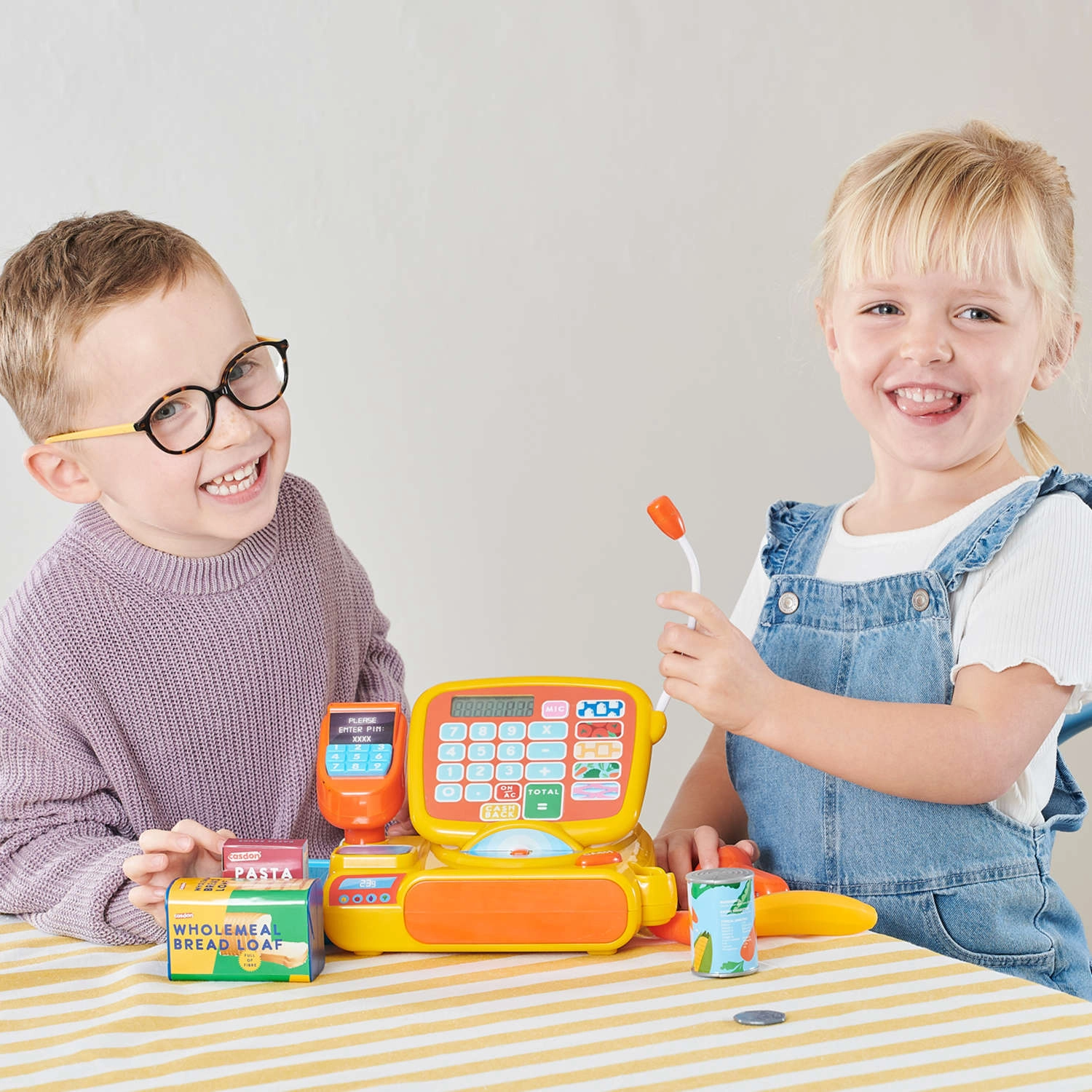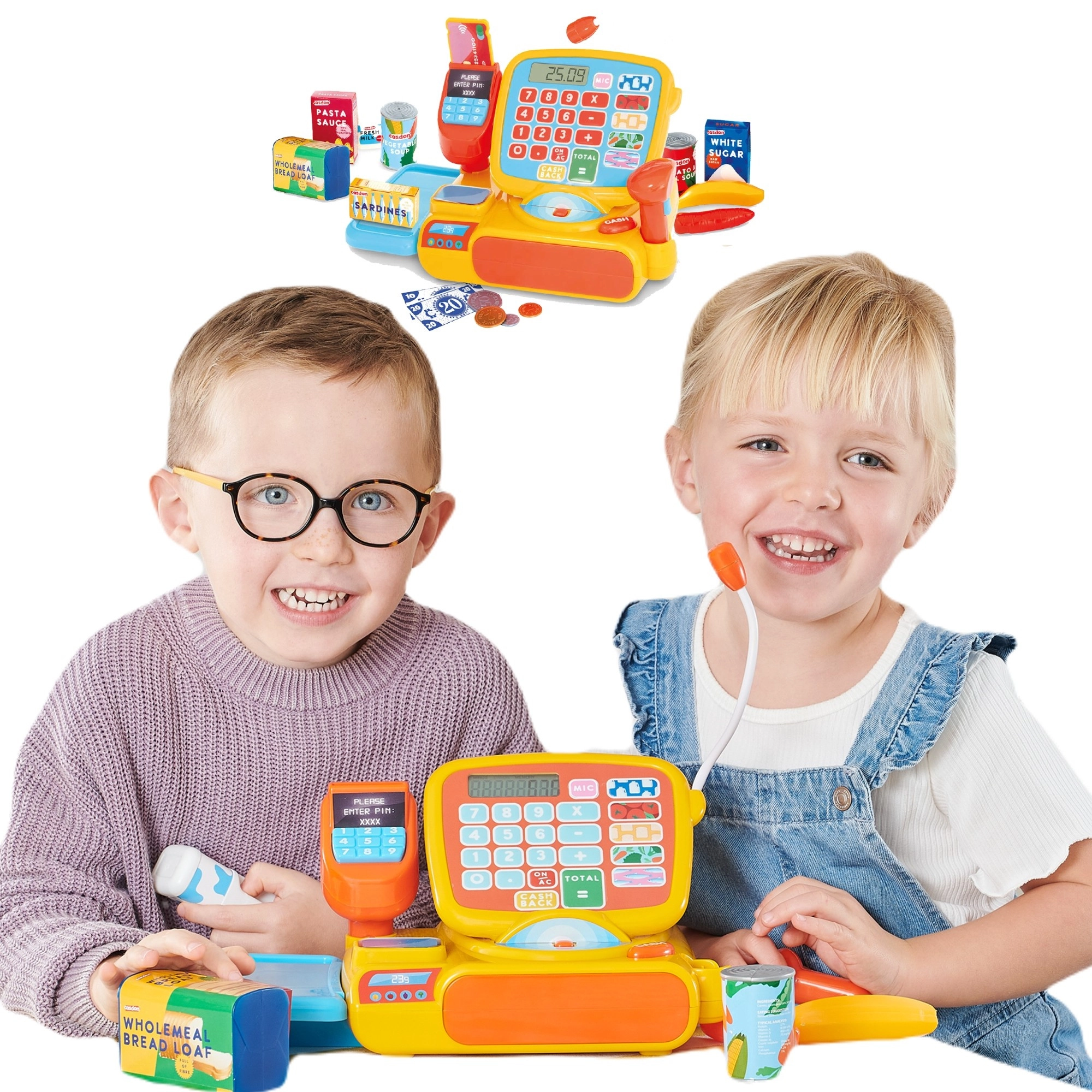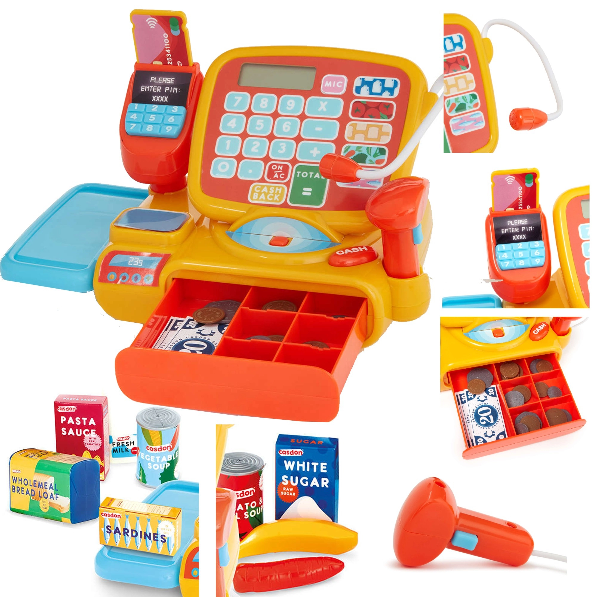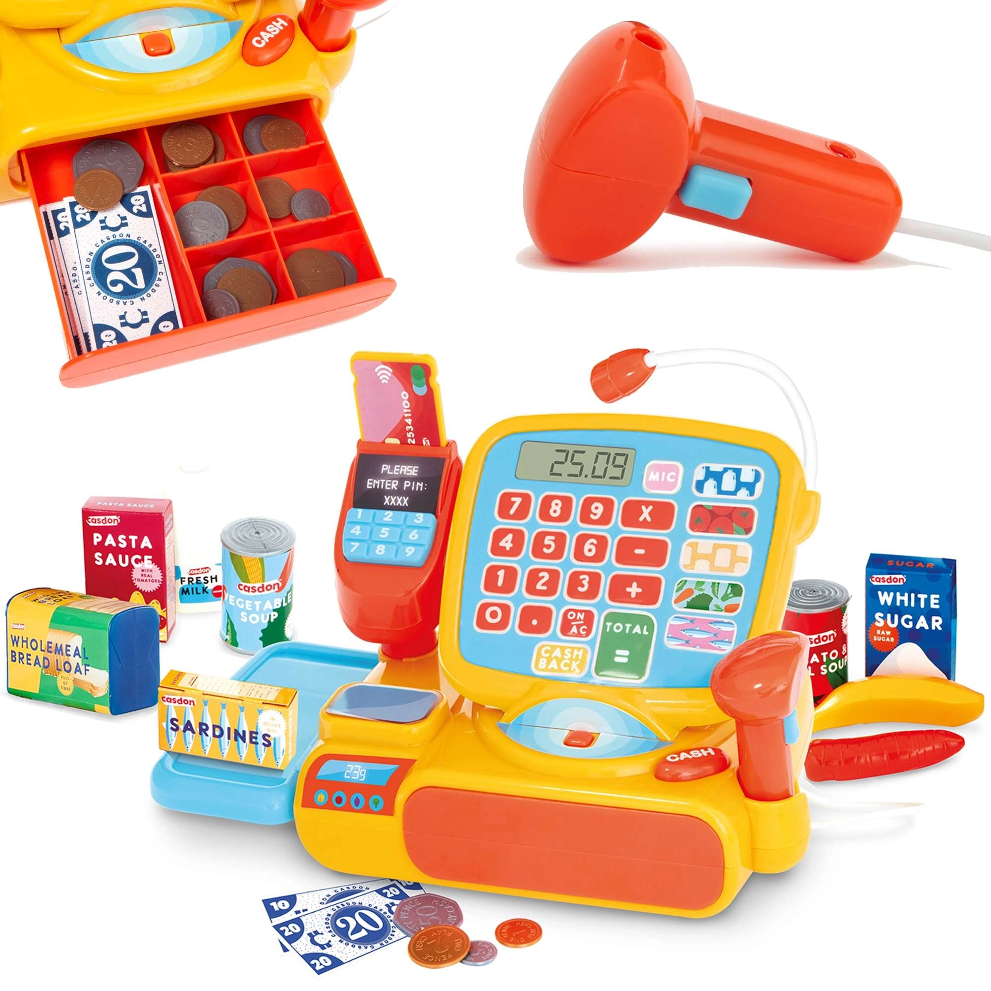 La colorata cassa giocattolo CASDON offre un gioco realistico del negozio con ricchi accessori. Dispone di display funzionante con calcolatrice, scanner di codici a barre, lettore di carte, bilancia e cassetto portadenaro estraibile. Inclusi banconote, monete, carta di pagamento e alimenti finti. Non mancano effetti sonori e microfono per un’esperienza ancora più realistica.