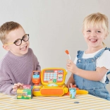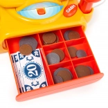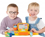 Incluso un ricco set di accessori: monete e banconote, carta di pagamento, scatoline di cartone, “latte”, due finte lattine e riproduzioni di limone, carota e pane. Il cassetto della cassa estraibile ha scomparti per un’ordinata suddivisione del denaro. La cassa si accende con il pulsante ON/AC sulla tastiera della calcolatrice.