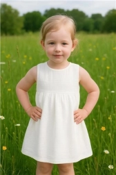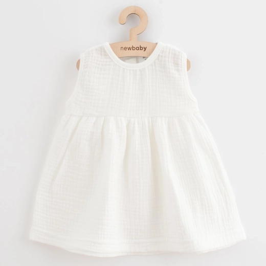 Leggerissimo e traspirante vestitino in mussola per bambini New Baby Elizabeth per piccole eleganti. Senza maniche, con taglio ad A, gonnellina arricciata sollevata e chiusura a bottoncino a pressione sul retro per un facile vestirsi. Realizzato in mussola di cotone 100%, morbida, delicata e gentile sulla pelle dei bambini.