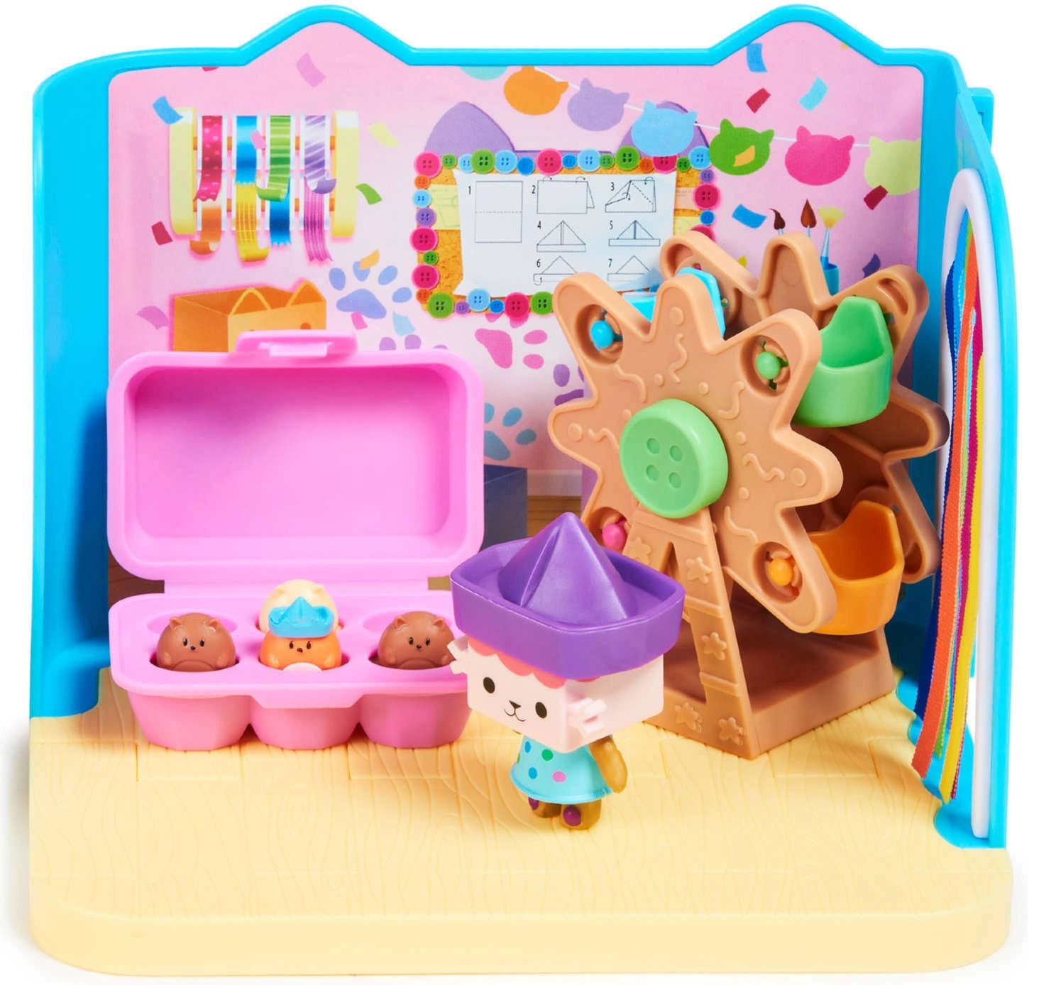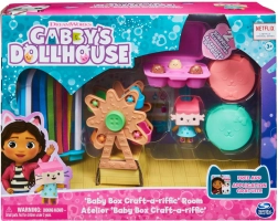 Il set “Baby Box Craft-a-riffic Room” è un’aggiunta originale all’ecosistema di gioco Gabby’s Dollhouse: si può usare da solo o collegare alla grande casetta.