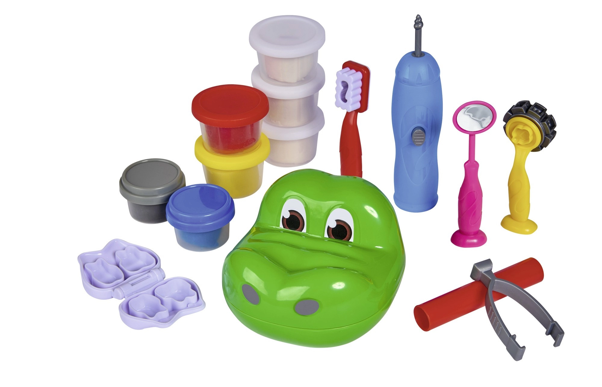 Questo set dentistico con coccodrillo offre una simulazione realistica ma giocosa delle cure dentali. Grazie ai numerosi accessori, i bambini possono modellare nuovi denti con la pasta, riparare carie, creare otturazioni e applicare apparecchi colorati. Sono inclusi anche uno spazzolino e uno specchietto per esercitarsi alla corretta igiene orale.