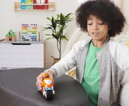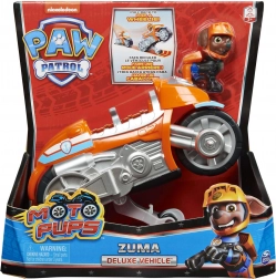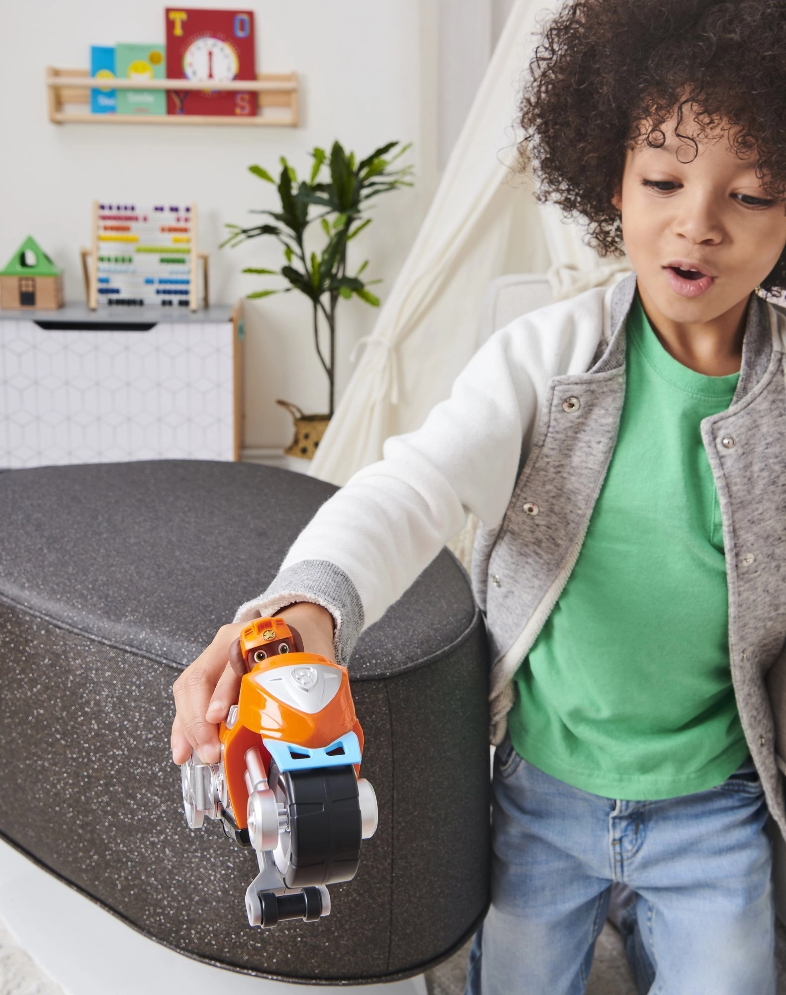 Il popolare soccorritore acquatico Zuma, il labrador della squadra Paw Patrol, arriva nella dinamica edizione Moto Pups con la sua moto arancione e argento. Una volta caricata l’inerzia, si attiva il meccanismo di trazione che rivela la terza ruota nascosta per una migliore stabilità e una guida divertente su superfici lisce.