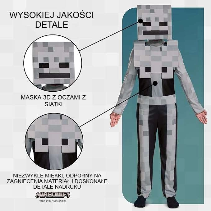 Il costume bianco‑grigio con stampa a quadretti ricorda fedelmente lo Skeleton di MINECRAFT e garantisce un look d’effetto in ogni occasione.
