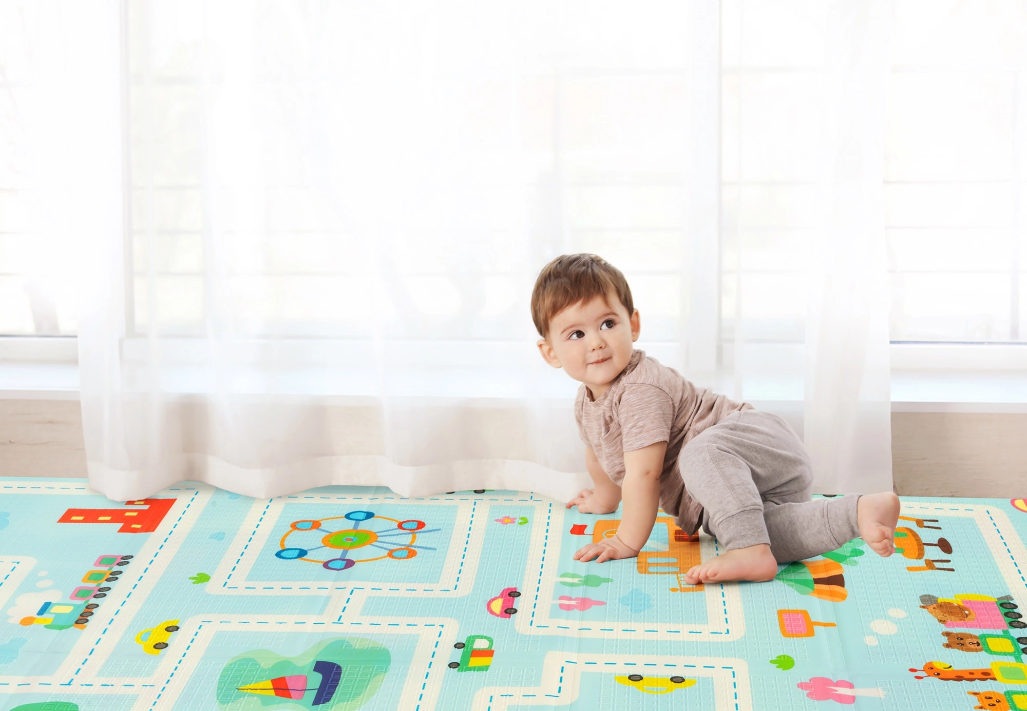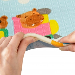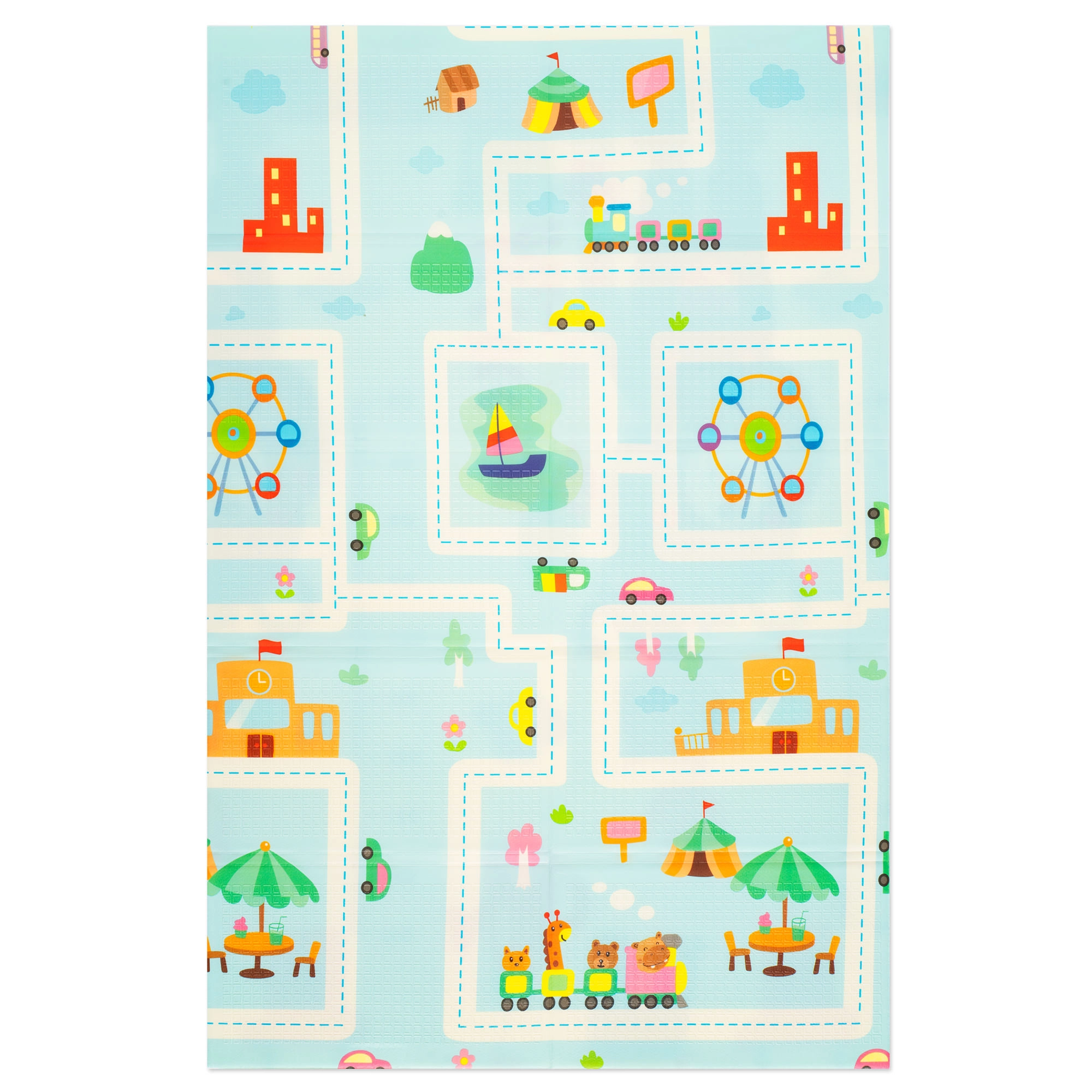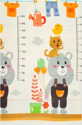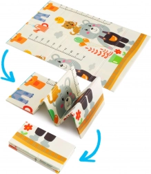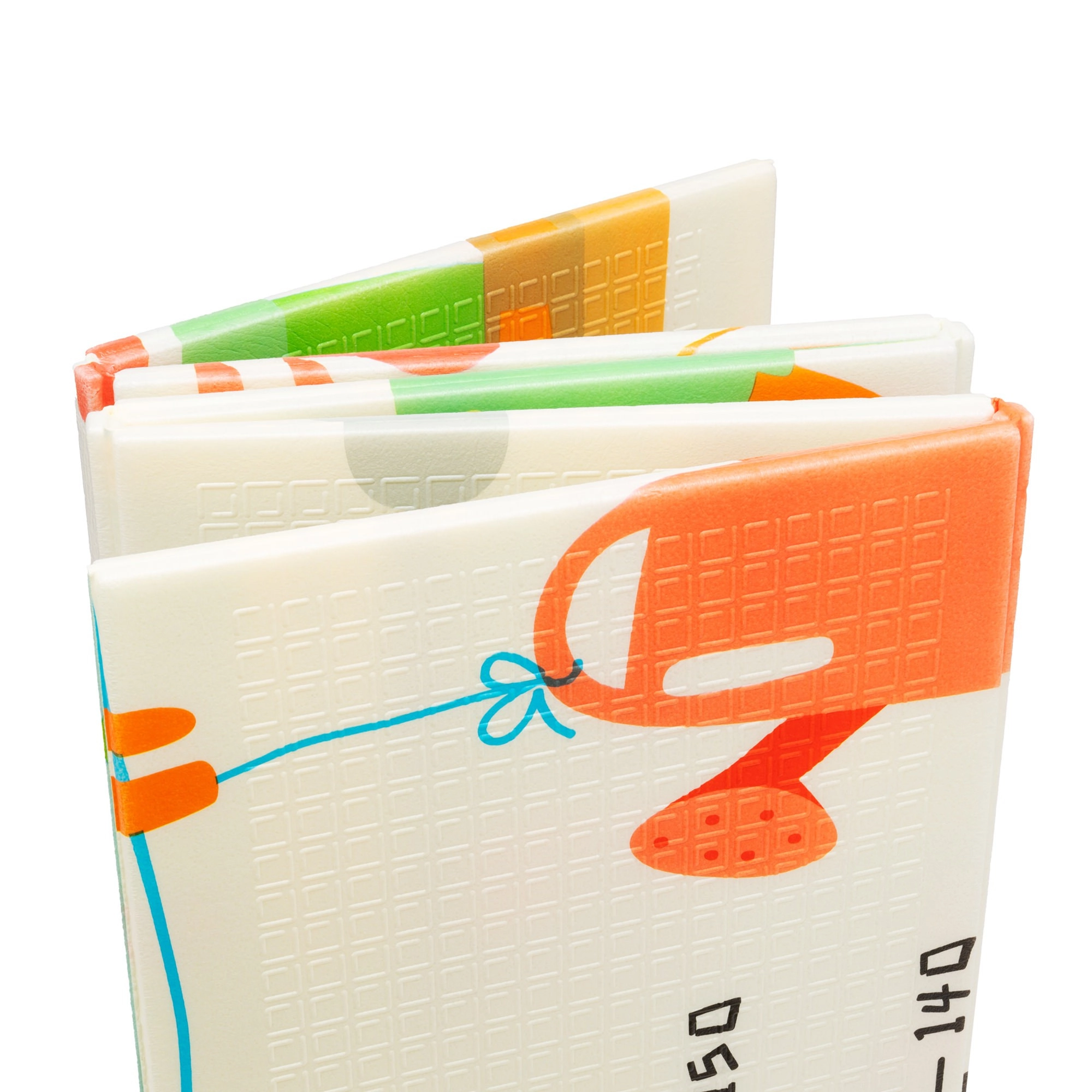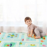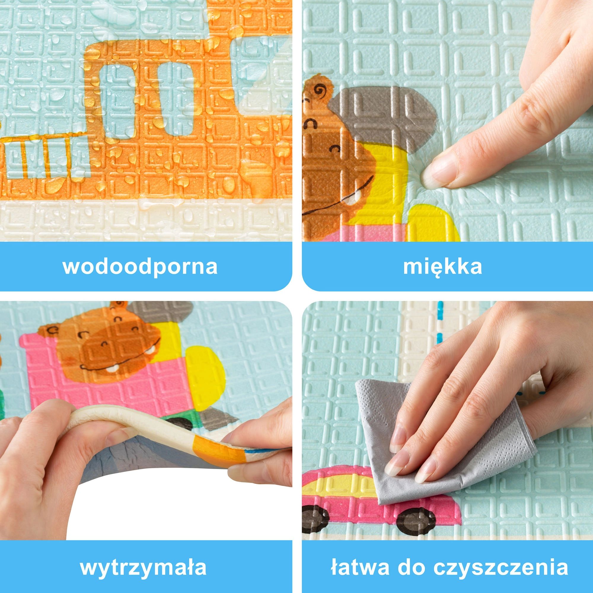 Il design bifacciale propone due motivi educativi: allegri animaletti con righello dell’altezza per monitorare la crescita e colorate strade con edifici e veicoli per sviluppare la fantasia. Il tappetino si piega in pochi secondi, si ripone facilmente e grazie alla borsa con cerniera inclusa lo porti ovunque: in salotto, in cameretta, sul balcone, in giardino e in viaggio.