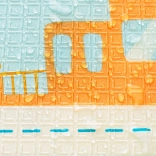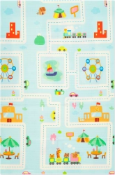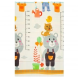 Un lato propone allegri motivi di animaletti con righello dell’altezza, l’altro lato strade e edifici colorati per stimolare fantasia e percezione sensoriale.