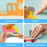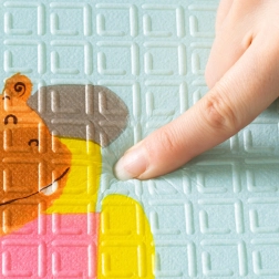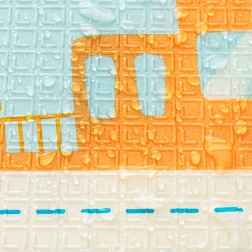 Schiuma XPE spessa, elastica e atossica che assorbe perfettamente gli urti, isola dal freddo del pavimento ed è priva di odori. La superficie è impermeabile e facile da pulire.