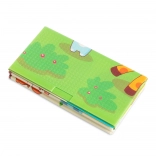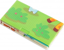 Due lati originali: tenere giraffe e allegri animaletti su uno sfondo colorato. Le illustrazioni a contrasto favoriscono la percezione visiva e l’apprendimento durante il gioco.