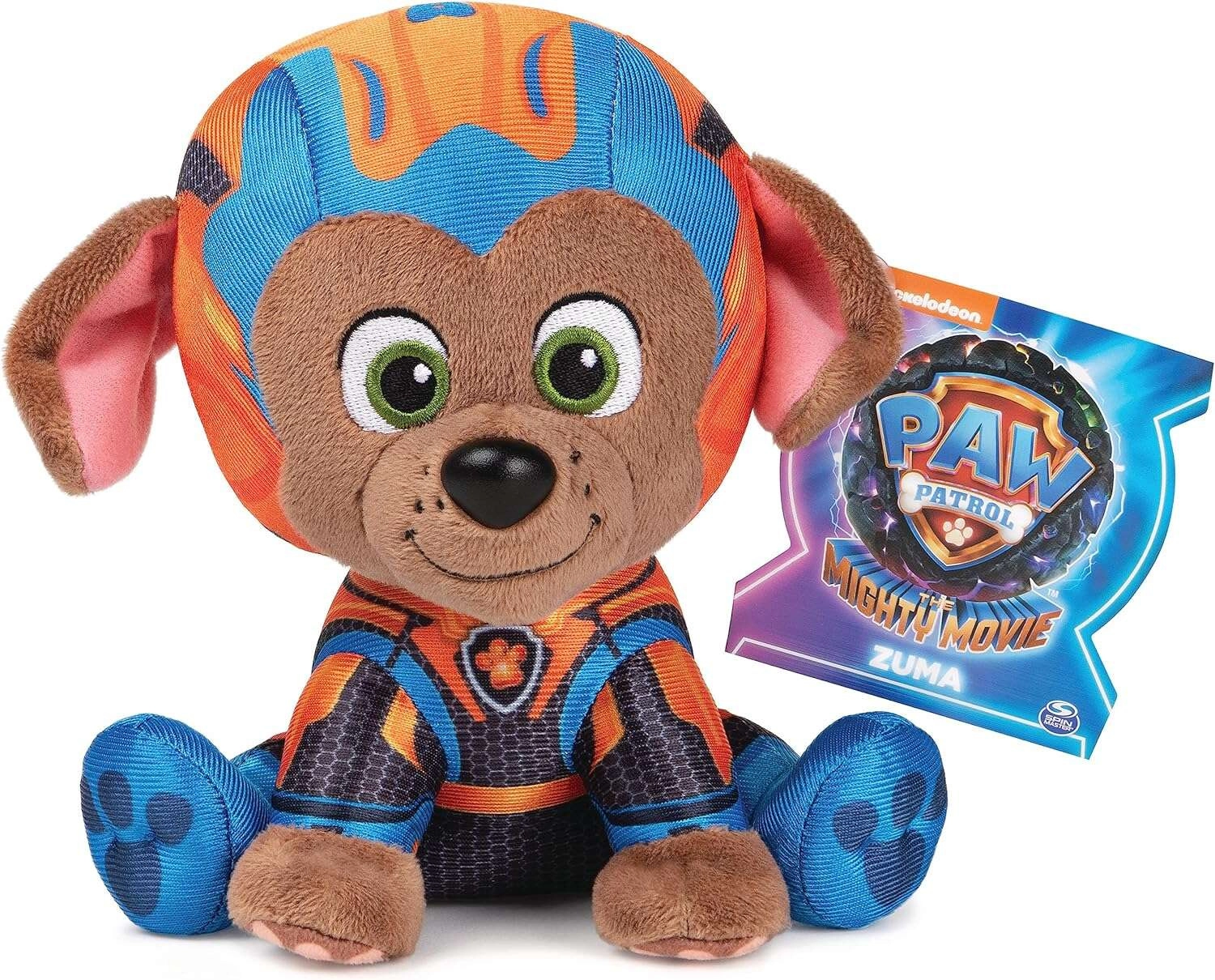 Il dolce cagnolino di peluche Zuma dal film PAW PATROL The Mighty Movie farà felici tutti i piccoli fan. È morbido, soffice al tatto e indossa un costume da supereroe blu‑arancione, ideale per coccole e gioco di fantasia a casa e in viaggio.
