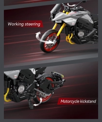 Grazie ai componenti mobili ti godrai sia la costruzione sia la presentazione finale: il modello ha manubrio sterzante, motore trasparente con pistoni mobili collegato alla ruota posteriore, catena funzionante, cambio a tre marce, sospensioni funzionanti e cavalletto regolabile. Non mancano faro, specchietti, cruscotto, dischi freno e carene modellate con precisione.