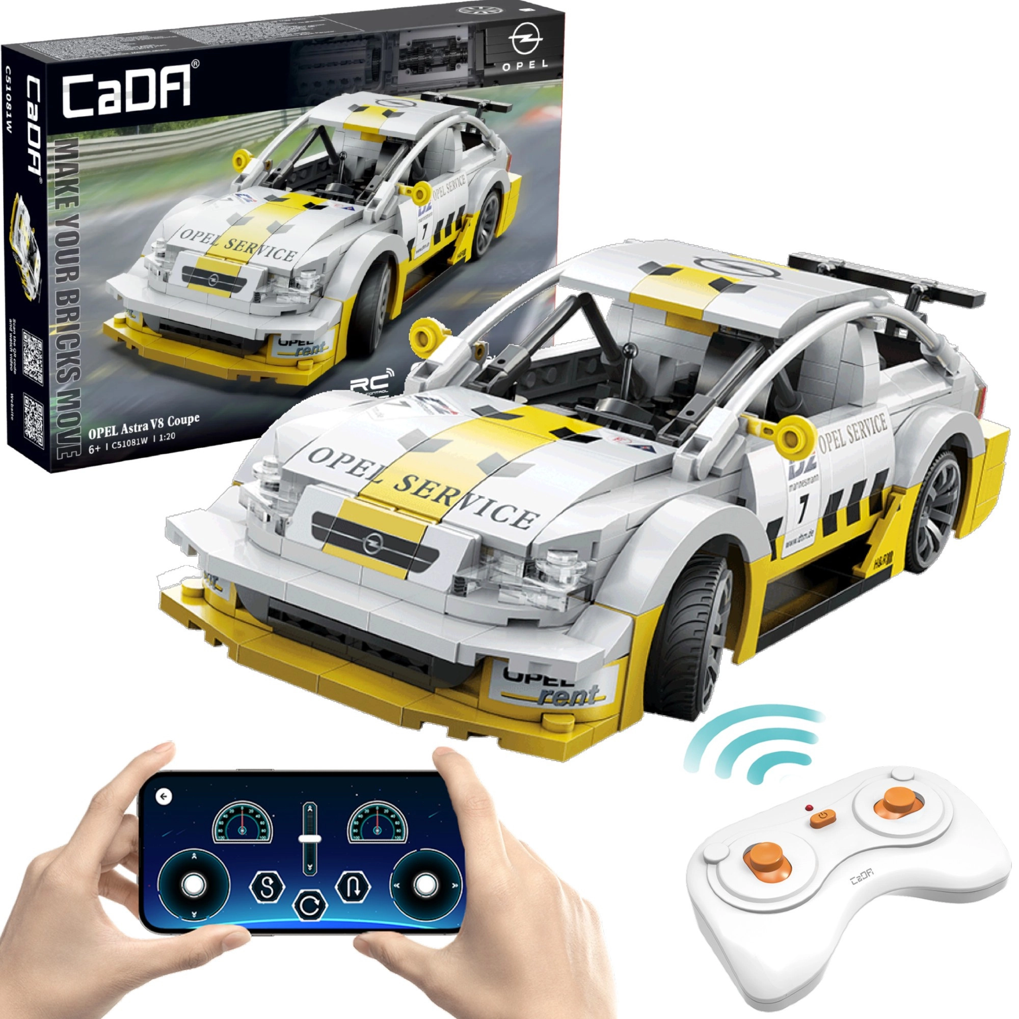 Goditi la costruzione e la guida con il modello dettagliato OPEL Astra V8 Coupé in scala 1:20. Il modello nella raffinata combinazione bianco‑gialla con adesivi realistici piacerà a collezionisti e bambini. Grazie al controllo Dual Mode puoi passare tra il telecomando 2,4 GHz e l’app mobile via Bluetooth: facile, rapido e divertente.