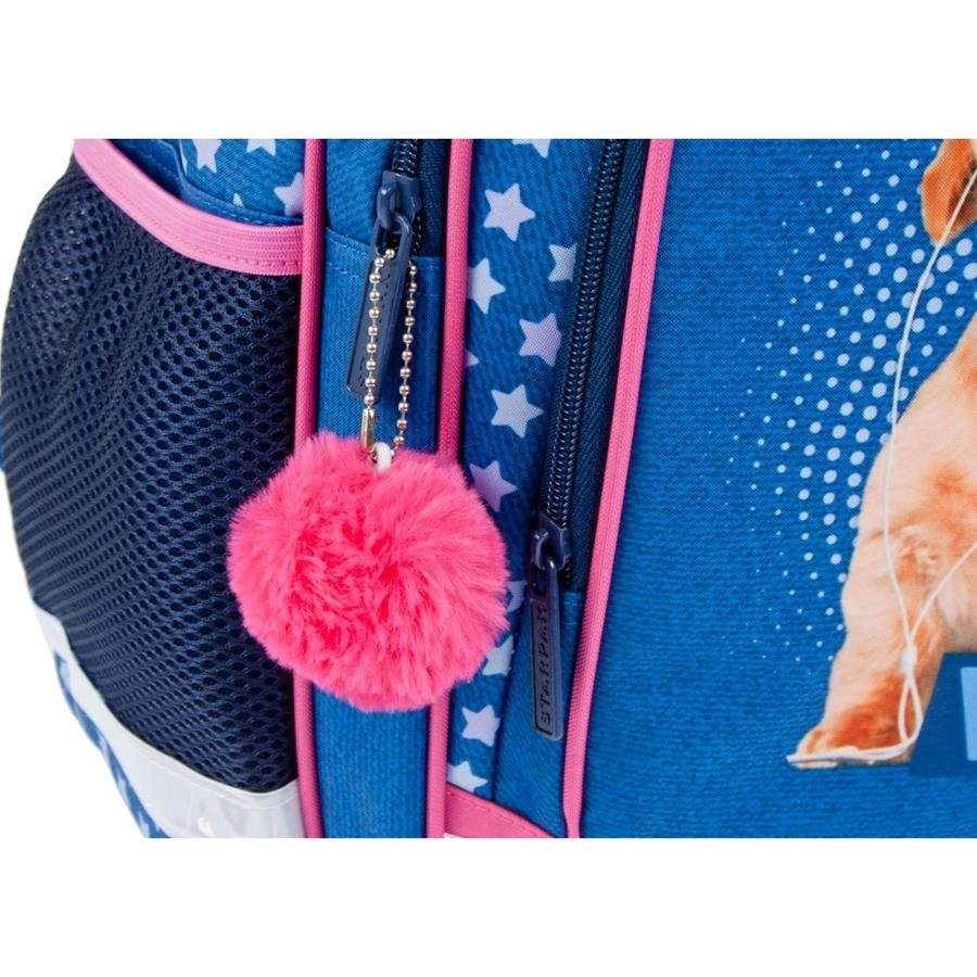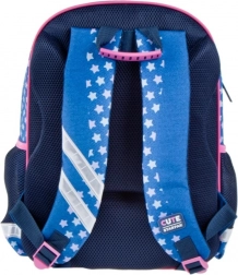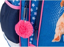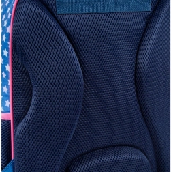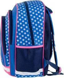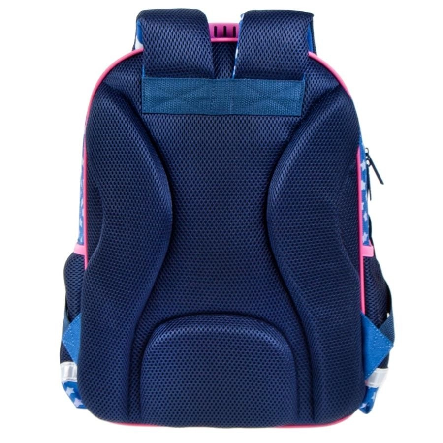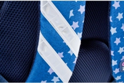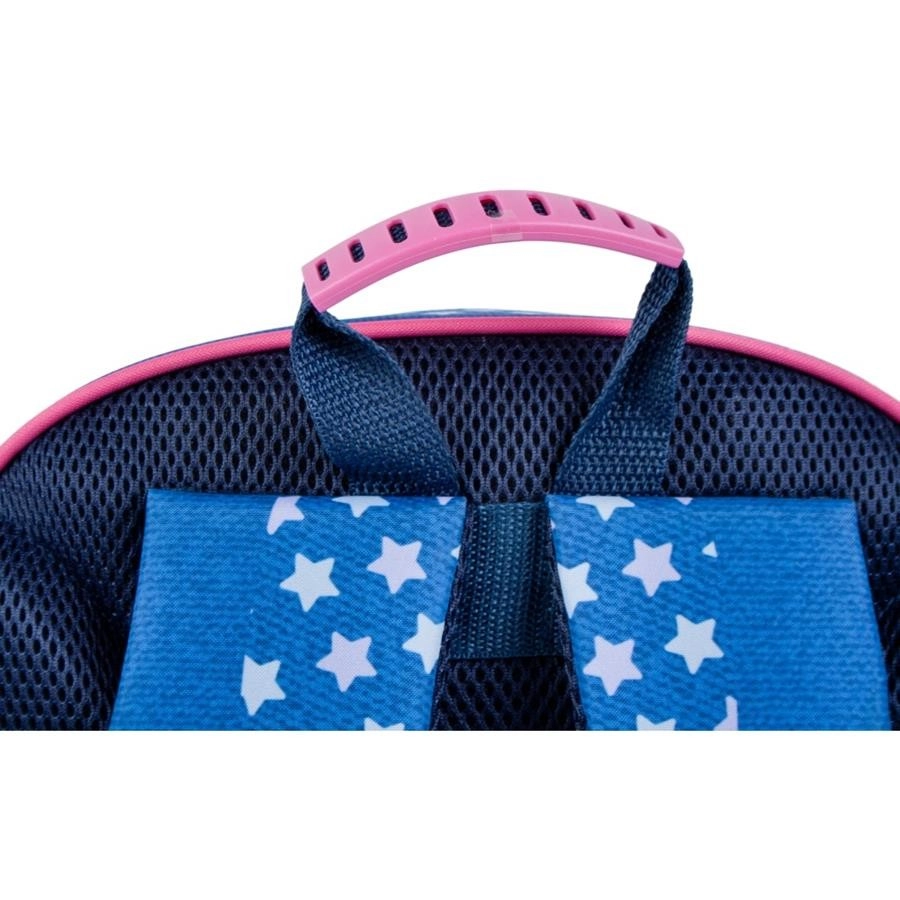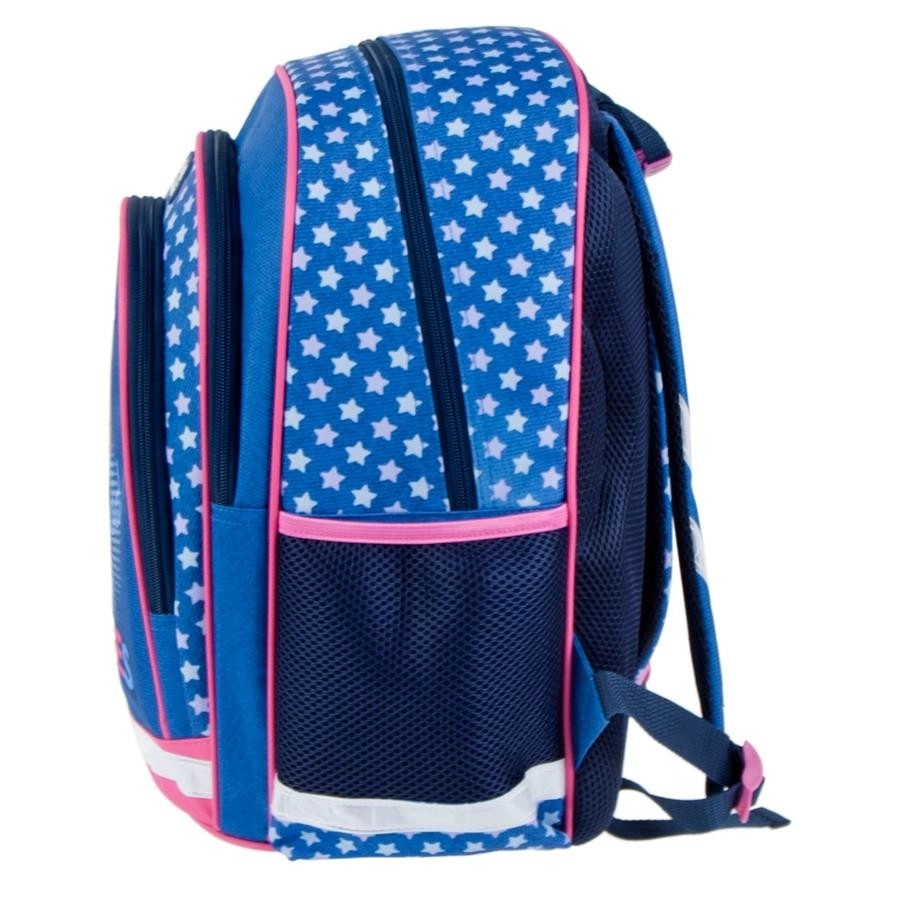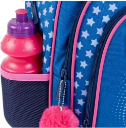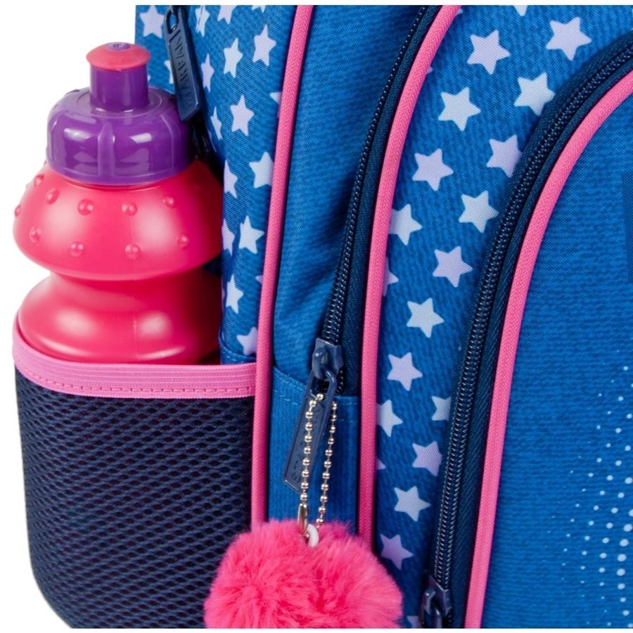 Questo zaino per bambini in combinazione blu–rosa colpisce per il design giocoso con stelline e convince per la praticità. Lo scomparto principale contiene libri, cartelline e merenda, mentre le due tasche frontali facilitano la sistemazione ordinata degli oggetti piccoli. Le tasche laterali in rete trasportano in sicurezza la bottiglia, così che tutto il necessario sia sempre a portata di mano.