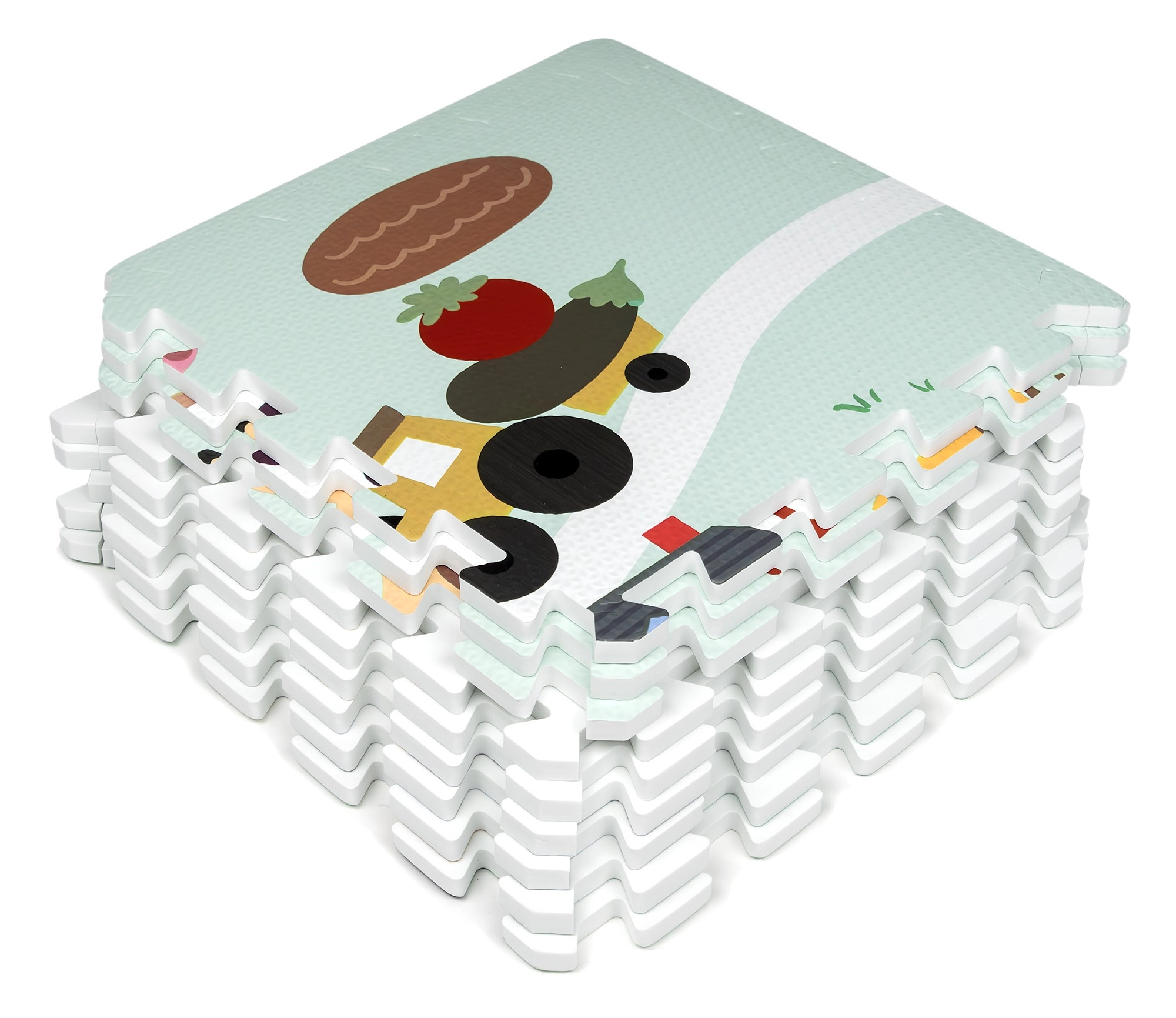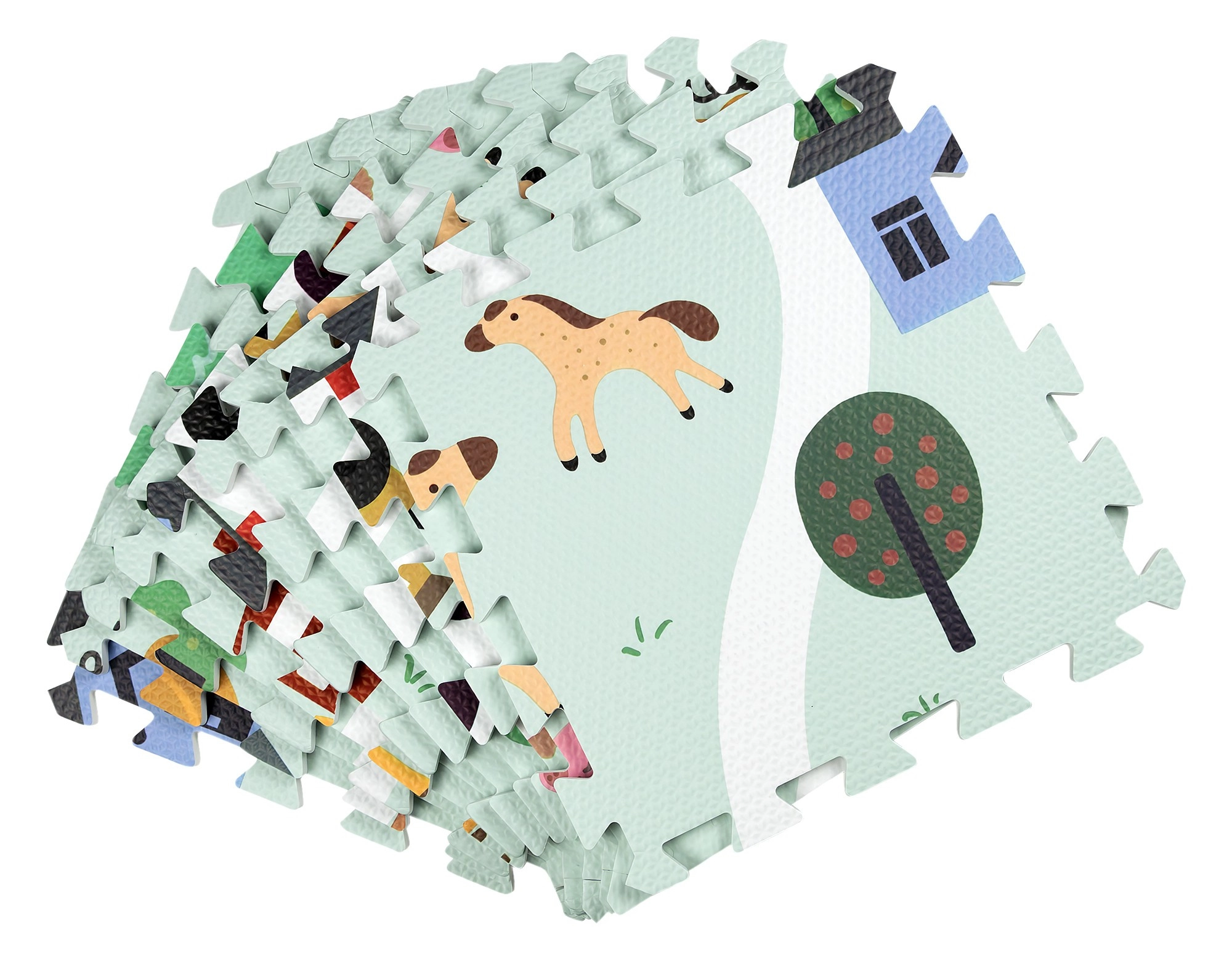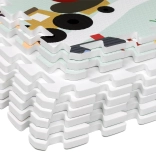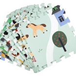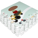 Morbido e sicuro tappetino per bambini in schiuma EVA composto da 9 pezzi da 30 × 30 cm con motivo fattoria. Offre isolamento dal freddo, assorbimento delle cadute e superficie antiscivolo. È impermeabile, facile da pulire e grazie ai bordi è possibile assemblare dai pezzi una superficie più grande o forme 3D (ad es. un cubo). Adatto dalla nascita, senza ftalati, formammide, PVC e BPA, conforme a EN 71 e REACH.
