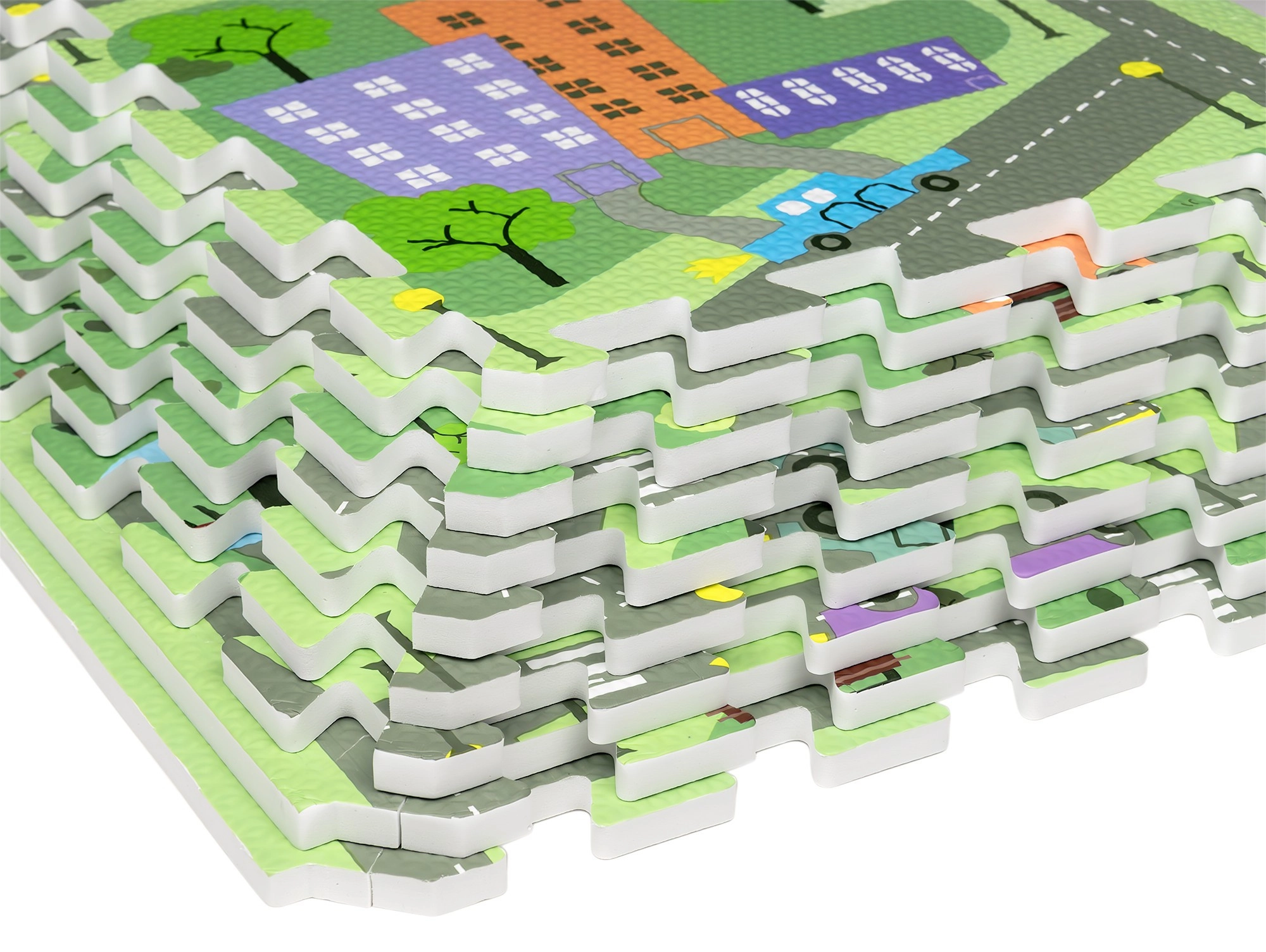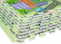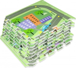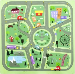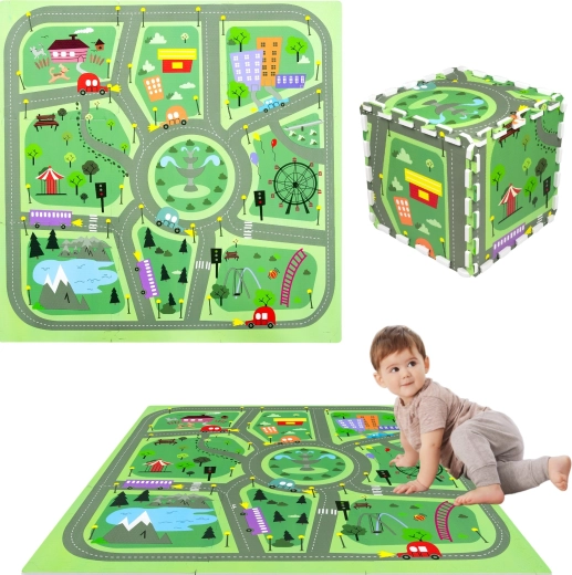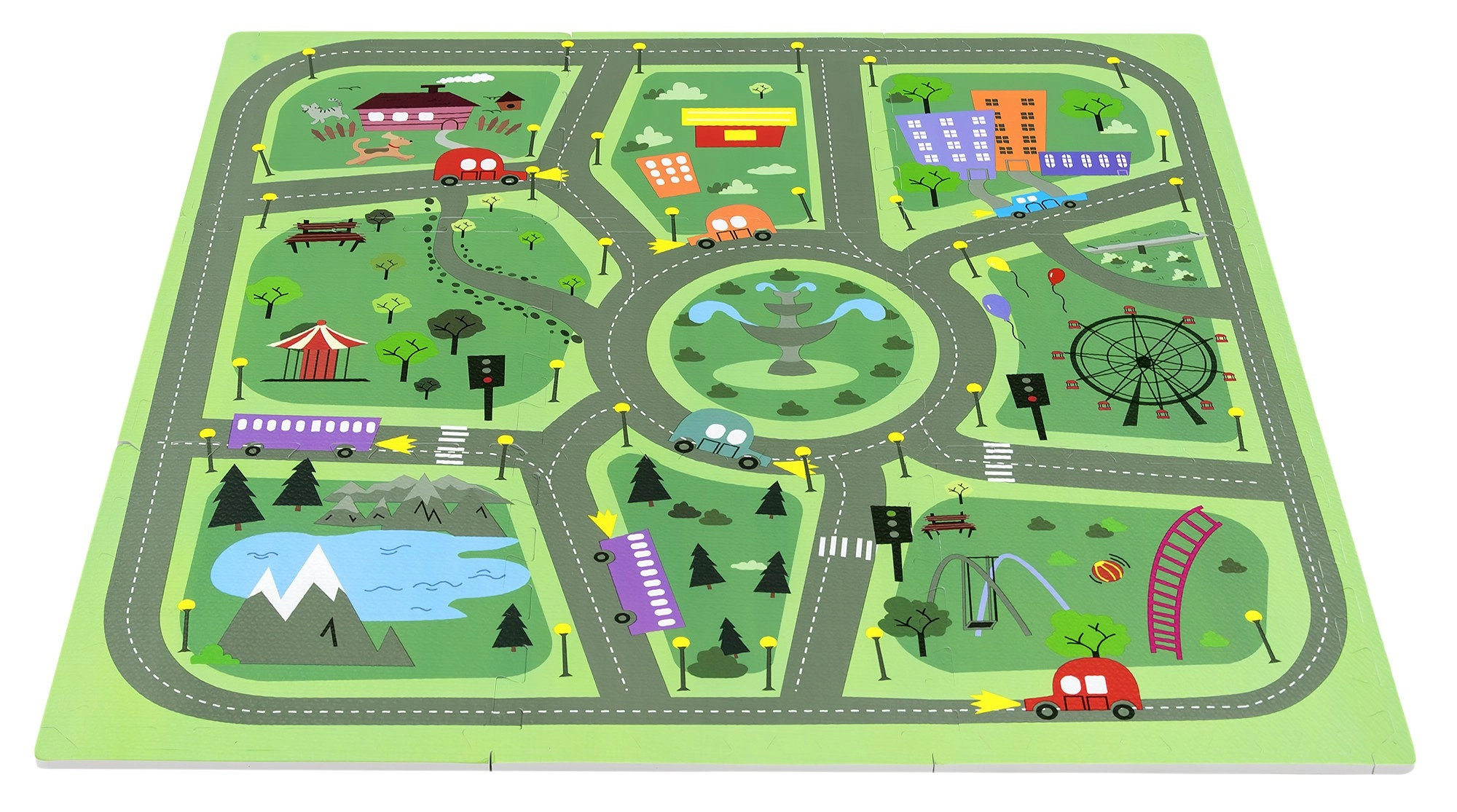 Create per il vostro bambino un luogo di gioco confortevole e igienico. Il tappetino in schiuma EVA elastica è privo di ftalati, formammide, PVC e BPA, ha una superficie antiscivolo e delicati rilievi per passi iniziali più sicuri. Il motivo pastello delle strade cittadine con rotonda, parchi, laghetto ed edifici stimola la fantasia e invita alle corse con le macchinine e al gioco creativo con le figurine.