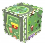 I 9 pezzi da 30 × 30 × 1 cm si uniscono facilmente per formare una superficie di 90 × 90 cm; le cornici perimetrali assicurano una finitura pulita. I pezzi possono essere collegati all’interno dello stesso modello per costruire anche forme 3D (ad es. un cubo). Il tappetino isola efficacemente dal freddo dei pavimenti duri (parquet, piastrelle, laminato) e attenua gli impatti.