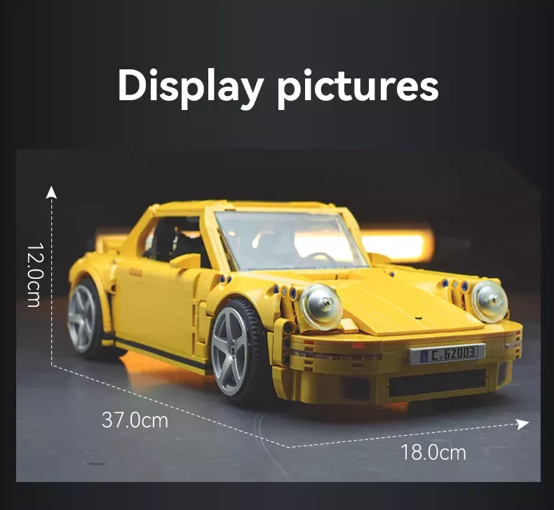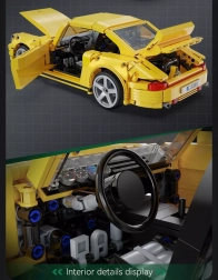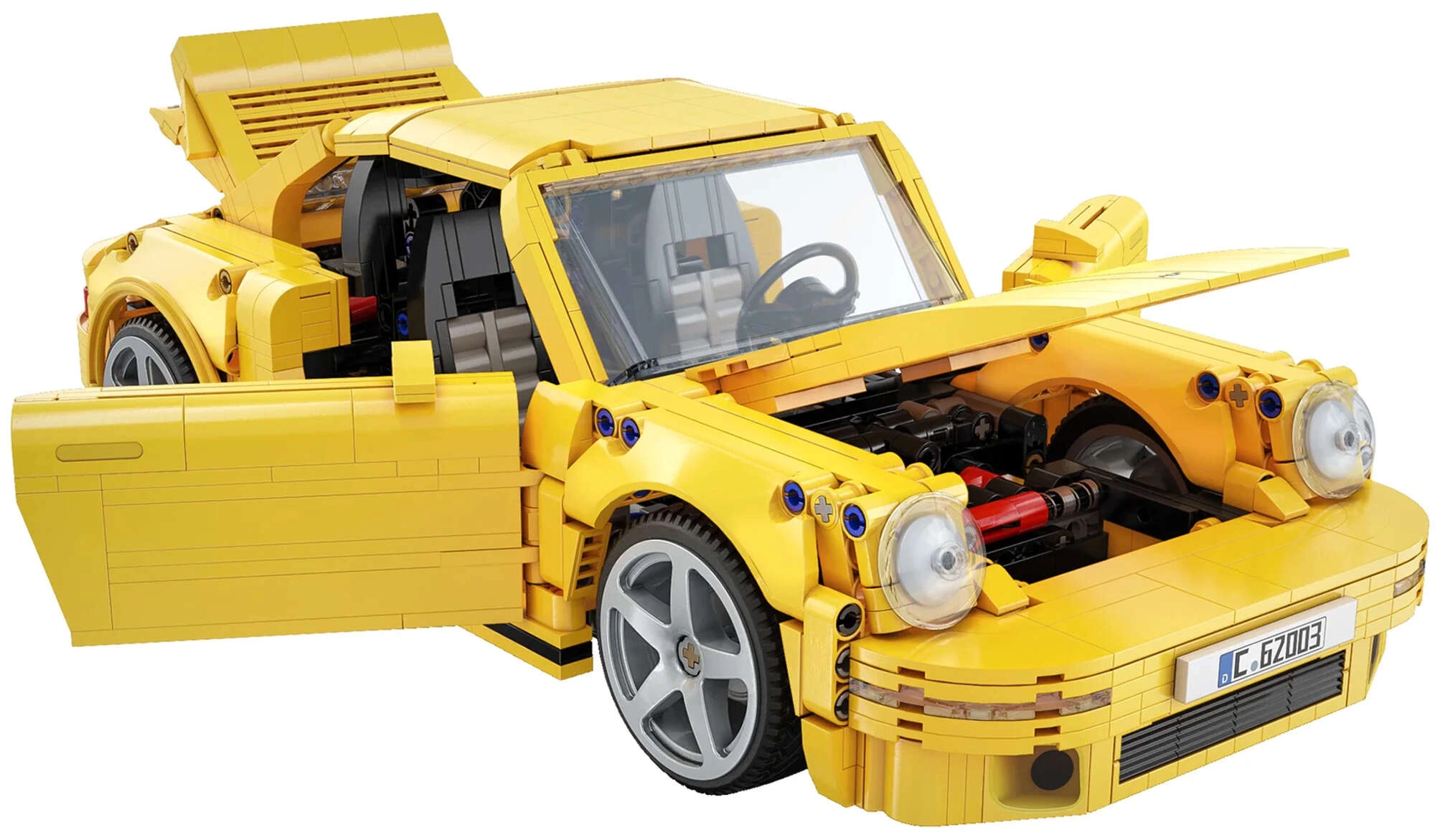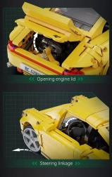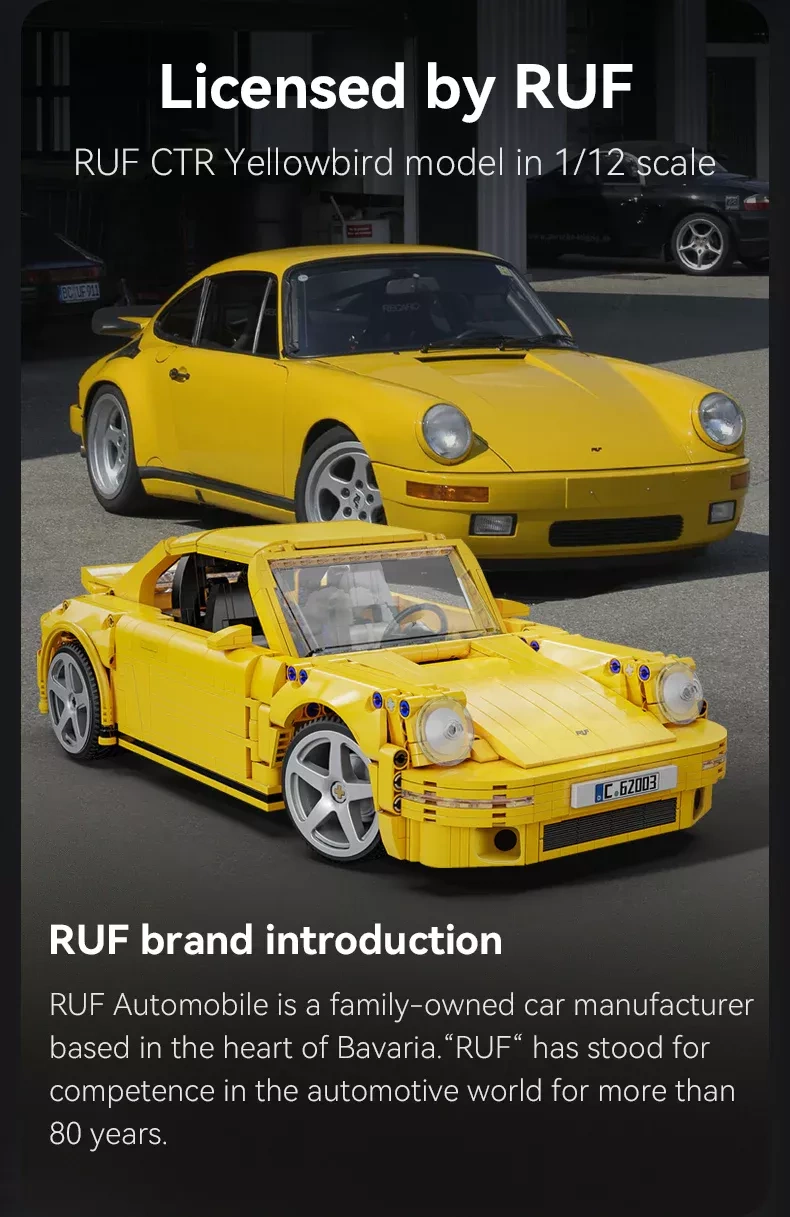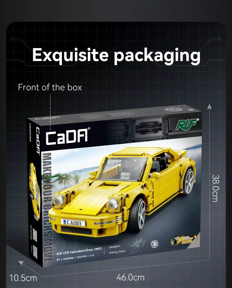 Goditi il set di costruzione CaDA che riproduce fedelmente la leggendaria RUF CTR Yellowbird in vivace giallo con dettagli neri. Il modello si distingue per meccanismi realistici, pannelli apribili e sterzo funzionante. Grazie alle gomme in caucciù e all’abitacolo ricco di dettagli con elementi autentici, è perfetto sia in esposizione sia per il gioco.